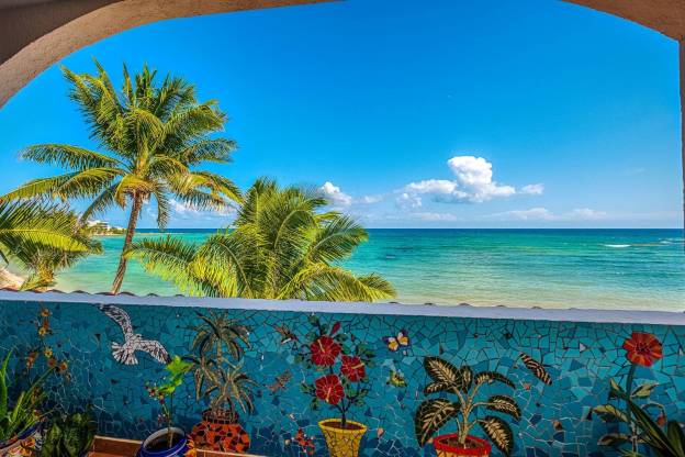 Sun-kissed villa with a panoramic view of the Caribbean Sea.