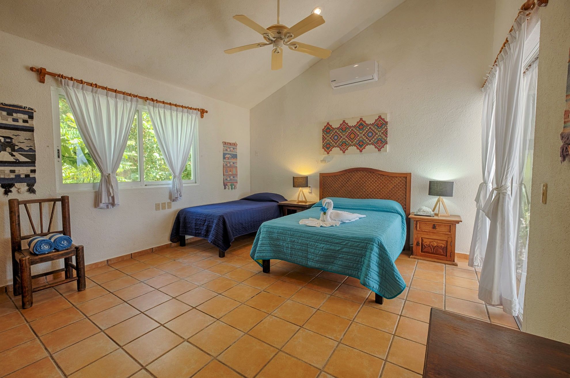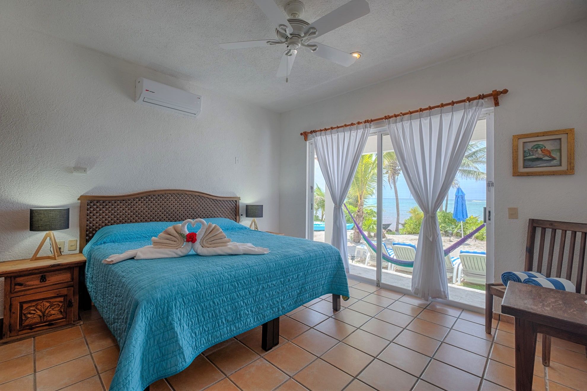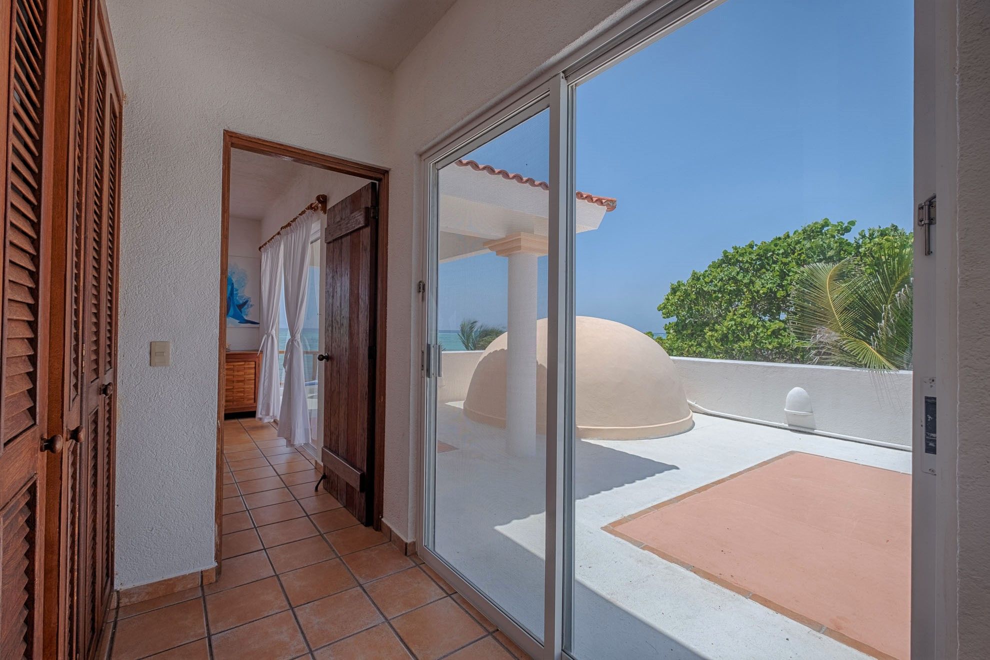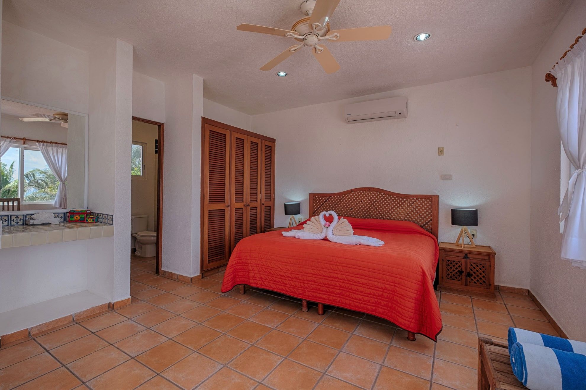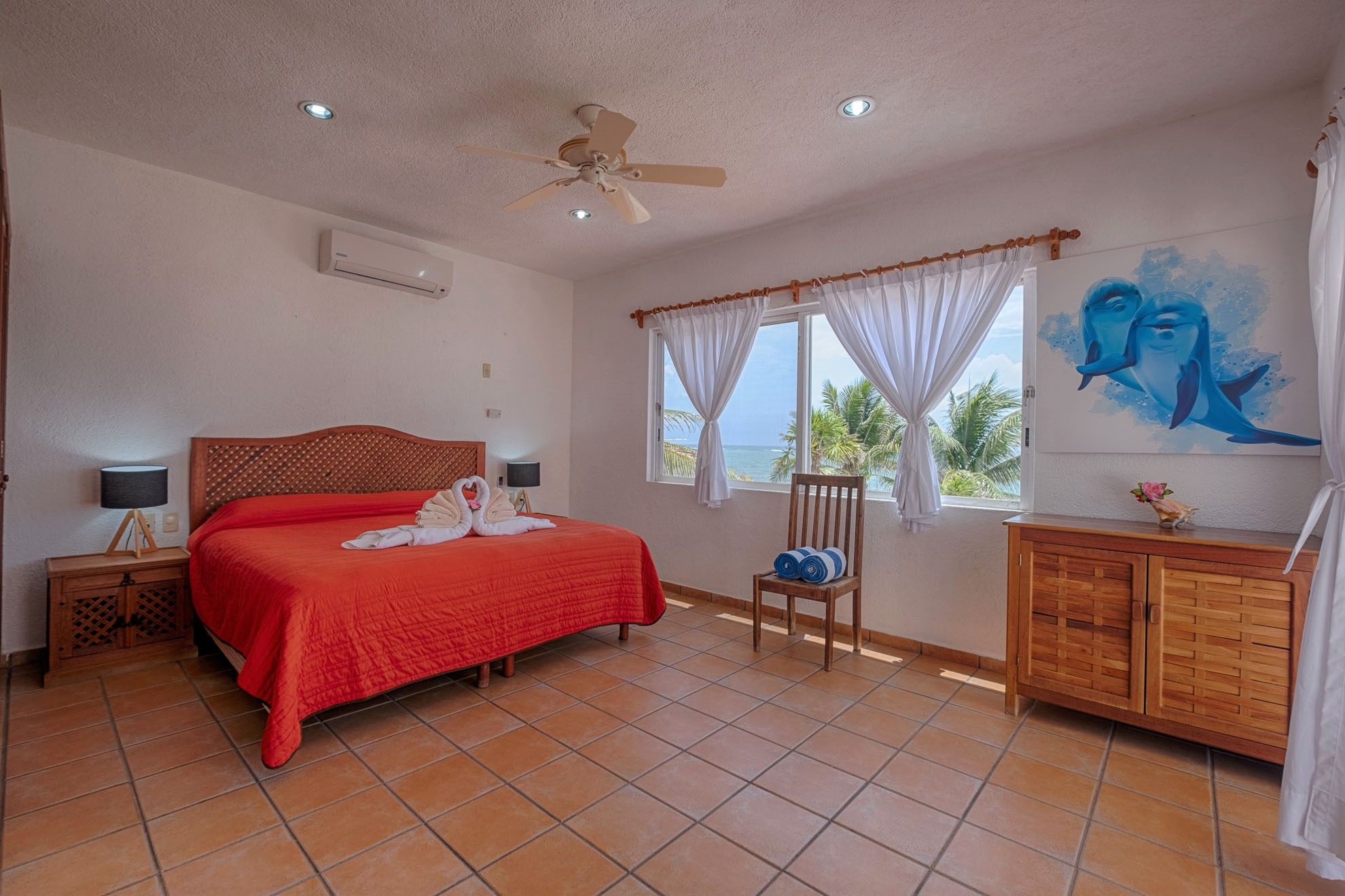 One of the lower-level bedrooms boasts a king-size bed and captivating views of Tankah Bay. The second guest room offers a queen bed and a single bed, with direct access to the patio. These bedrooms share a generously sized, well-appointed bathroom. Ascending to the upper floor unveils the primary suite, an oasis of calm with panoramic views of the Caribbean waters. This suite offers a king-size bed, an en-suite bathroom, and a private terrace overlooking the ocean, creating an ideal setting for relishing spectacular sunrises with coffee.