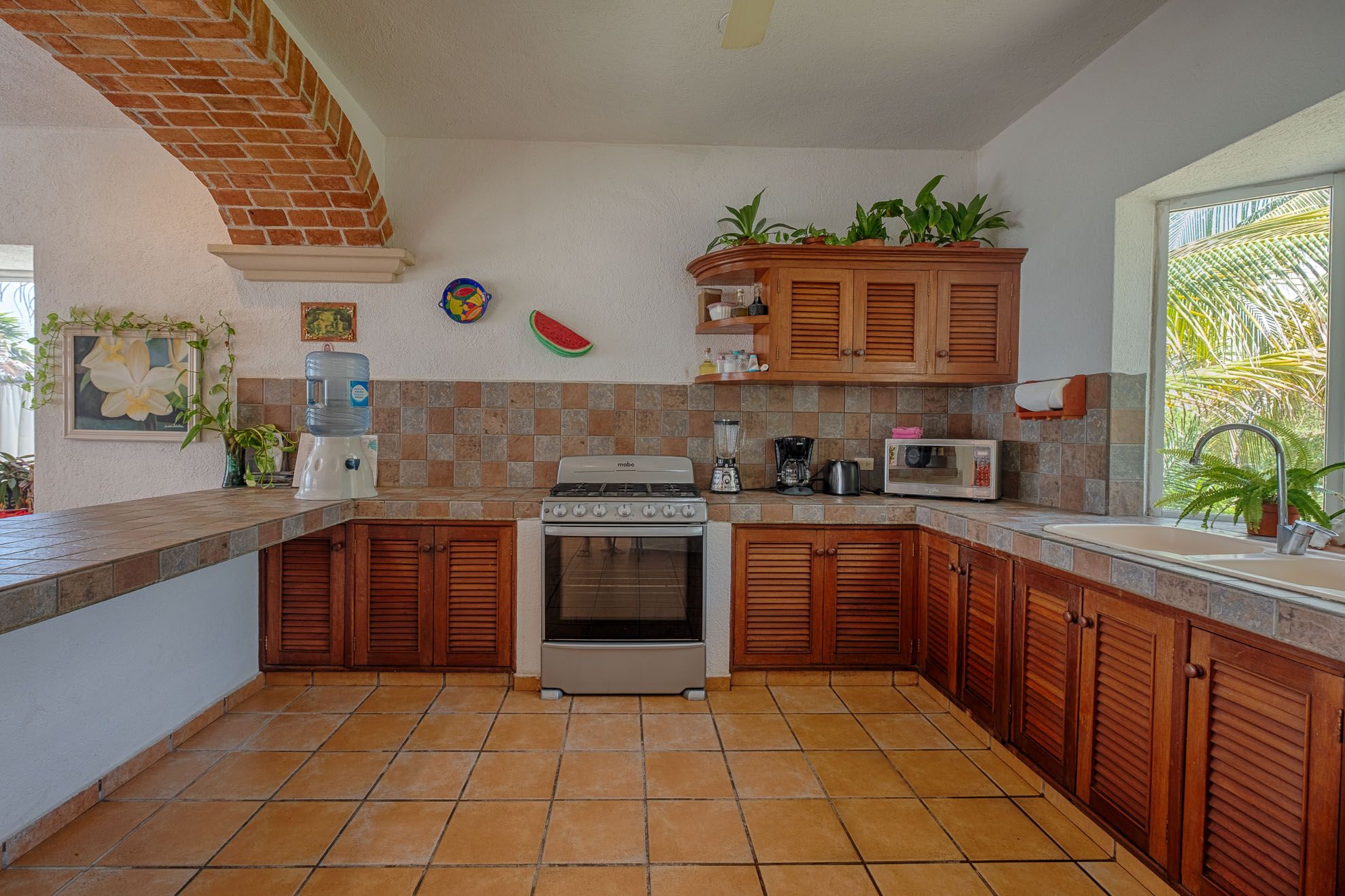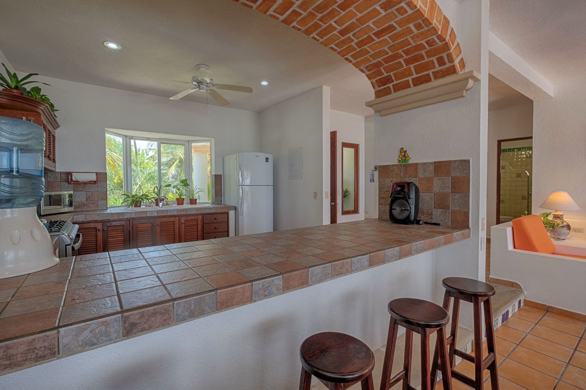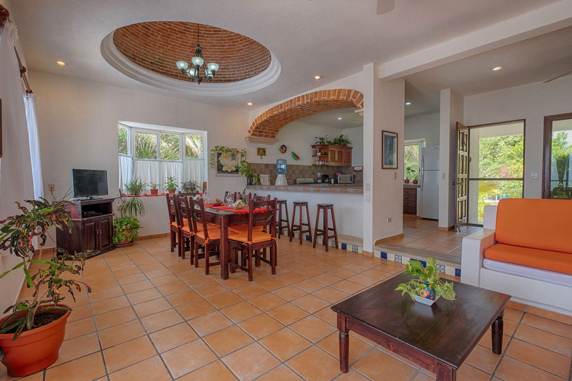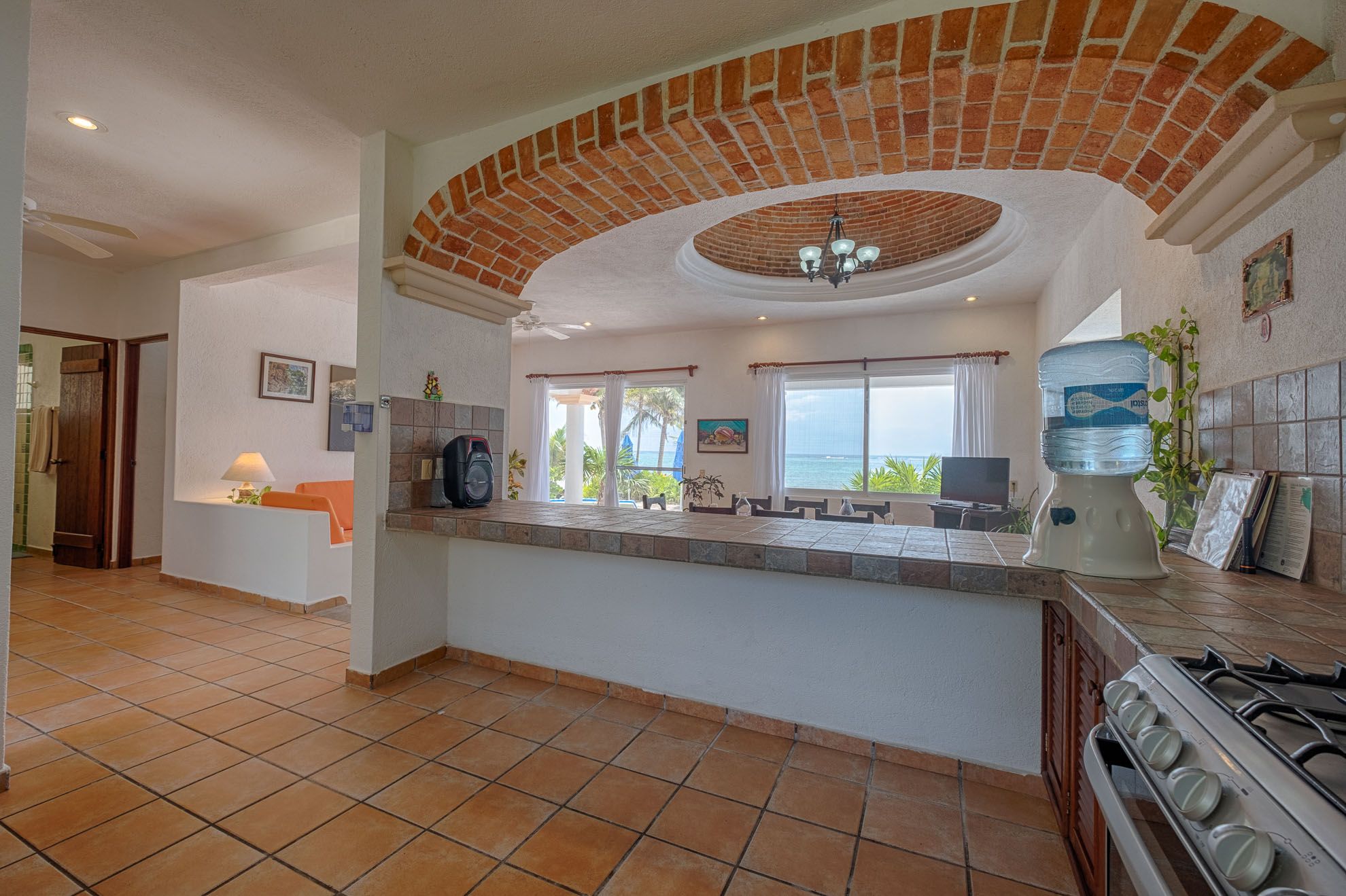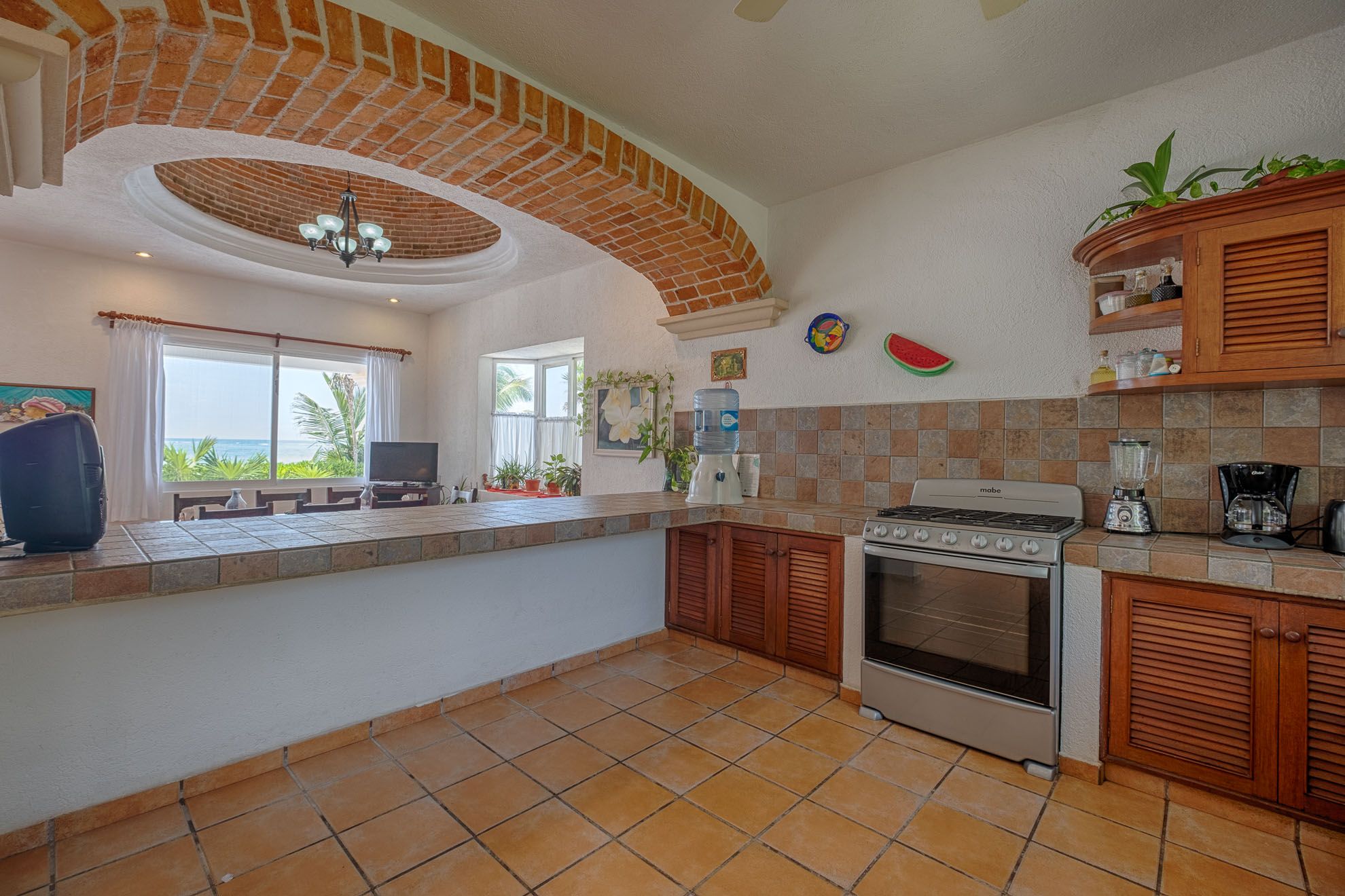 The interior features beautiful local furnishings, vibrant accents, and unique architectural details, such as the captivating brick arch framing the cozy breakfast nook. The open lower level seamlessly connects a stylish living space, a dining area accommodating eight, a fully-equipped kitchen, and two of the three bedrooms.