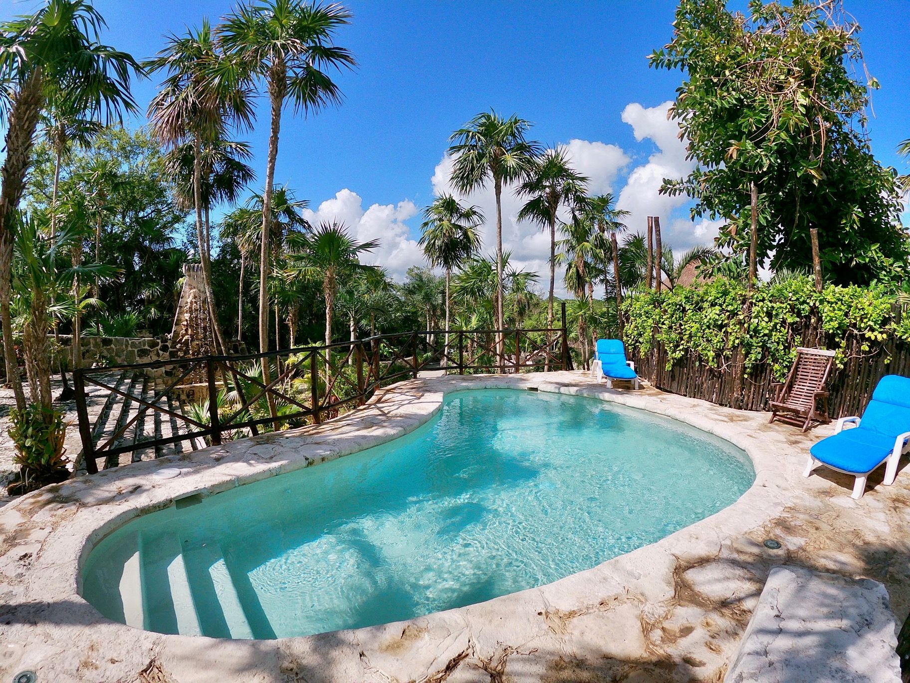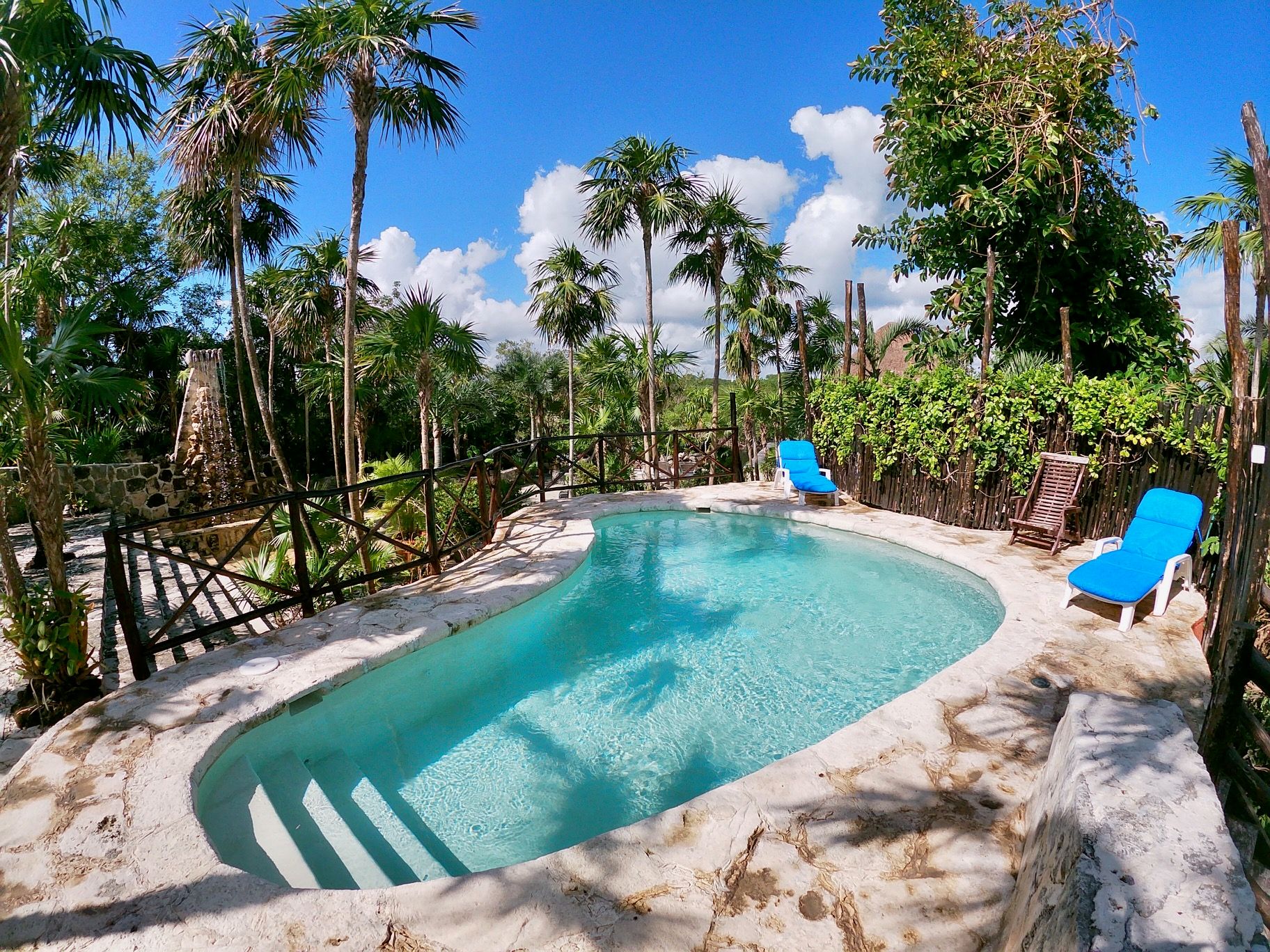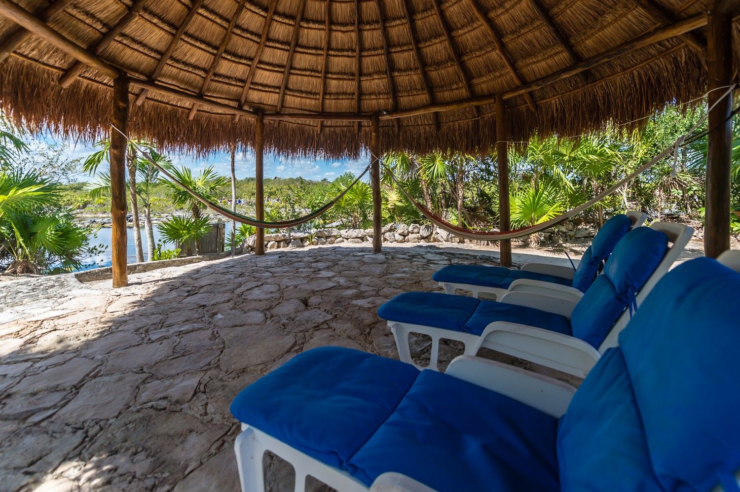 Shade palapas with loungers and hammocks Casa del Sol Yal-ku Lagoon Akumal Mexico 5 bedroom vacation rental
