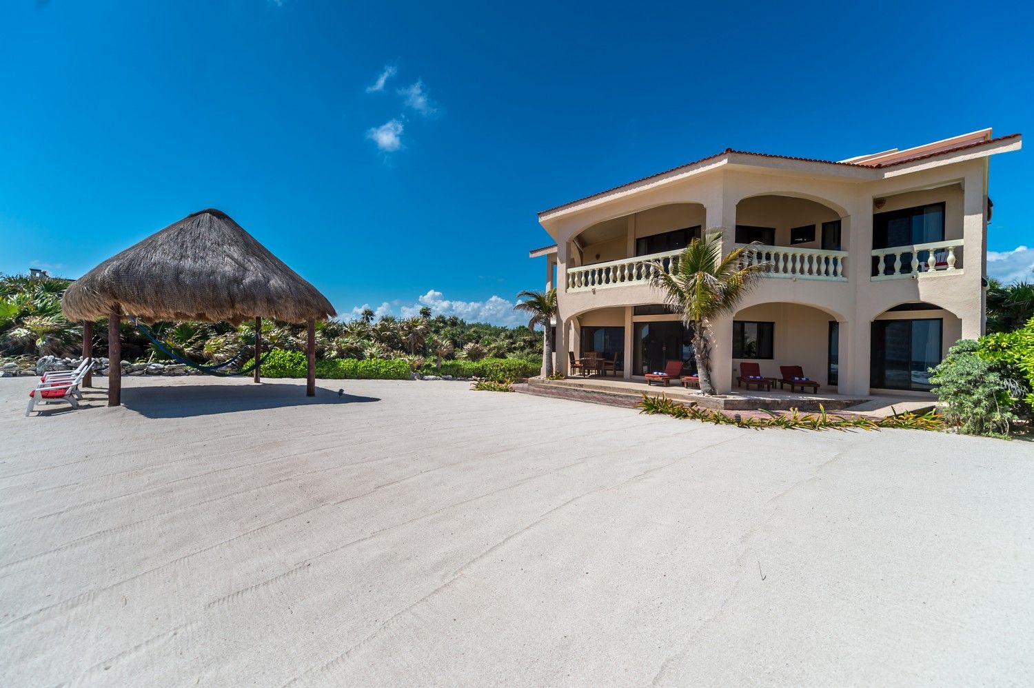 Oceanside palapa with hammocks and loungers Casa Dena Tankah Tulum Mexico vacation rental