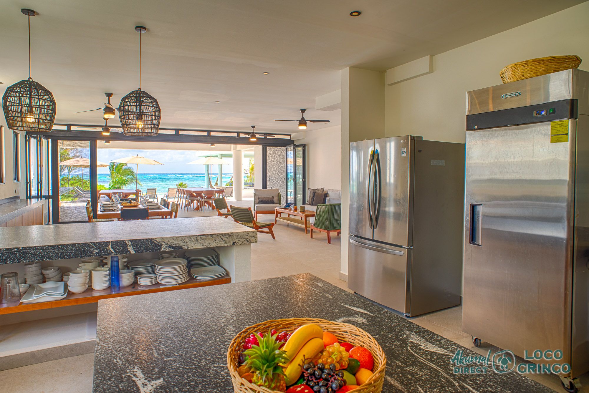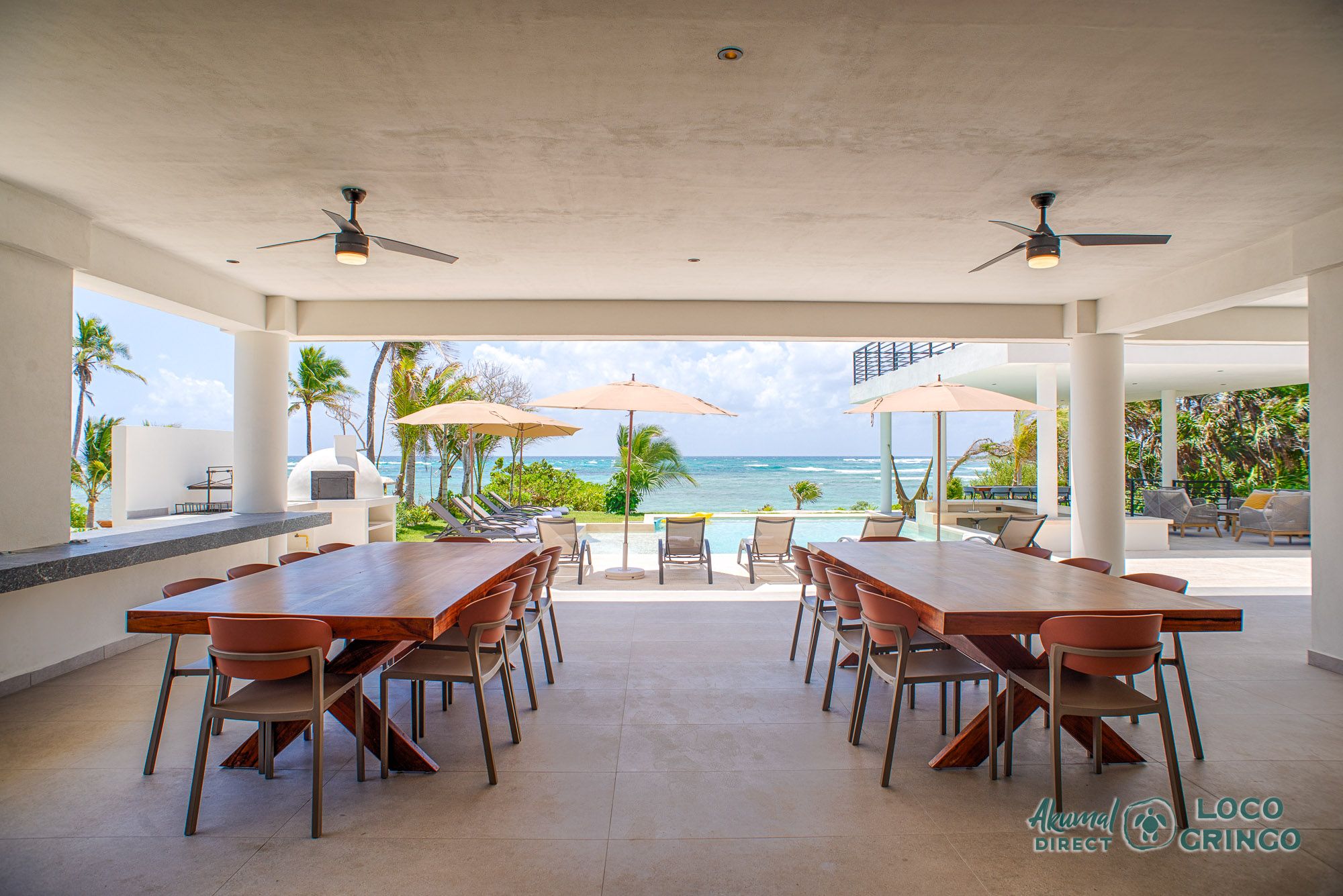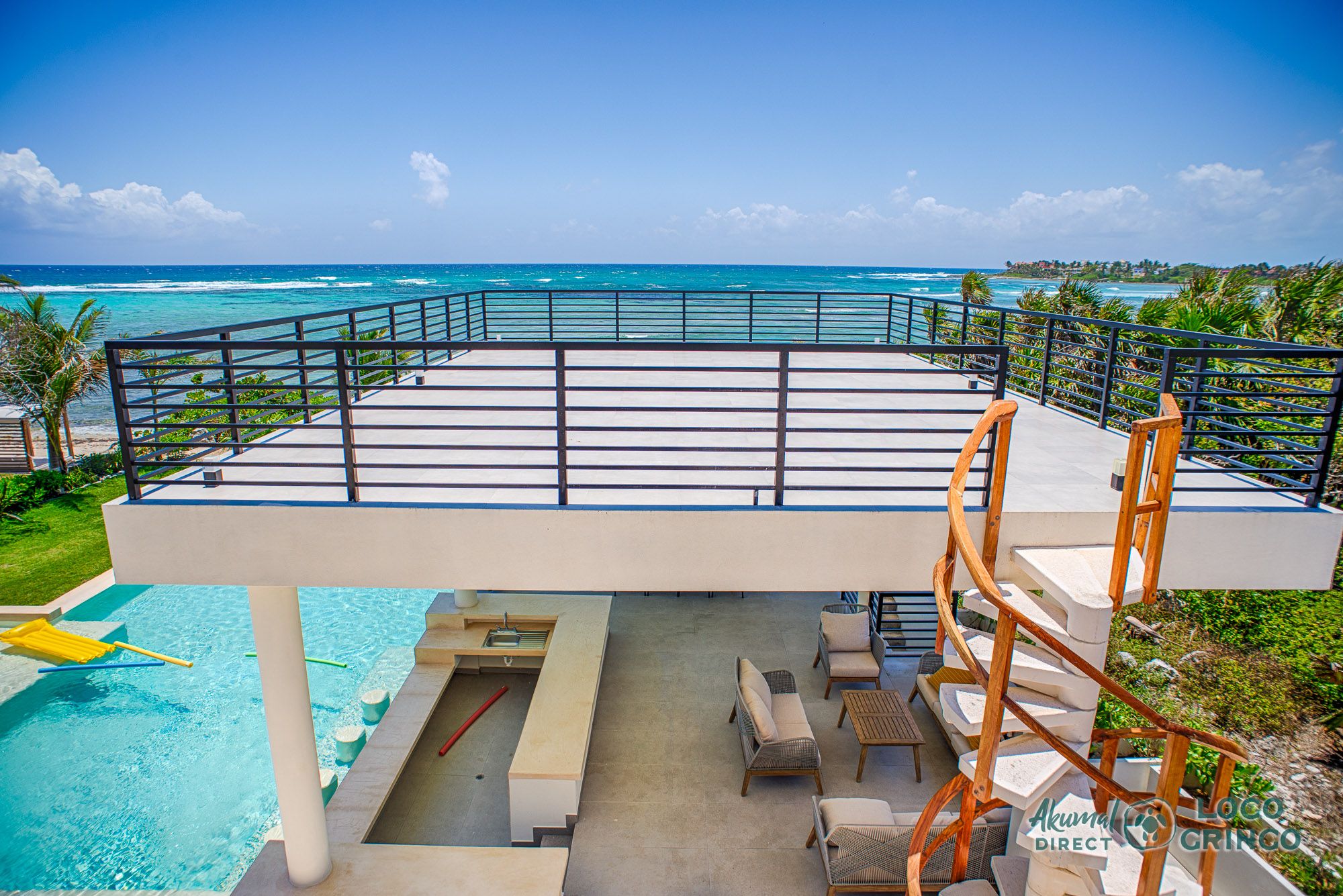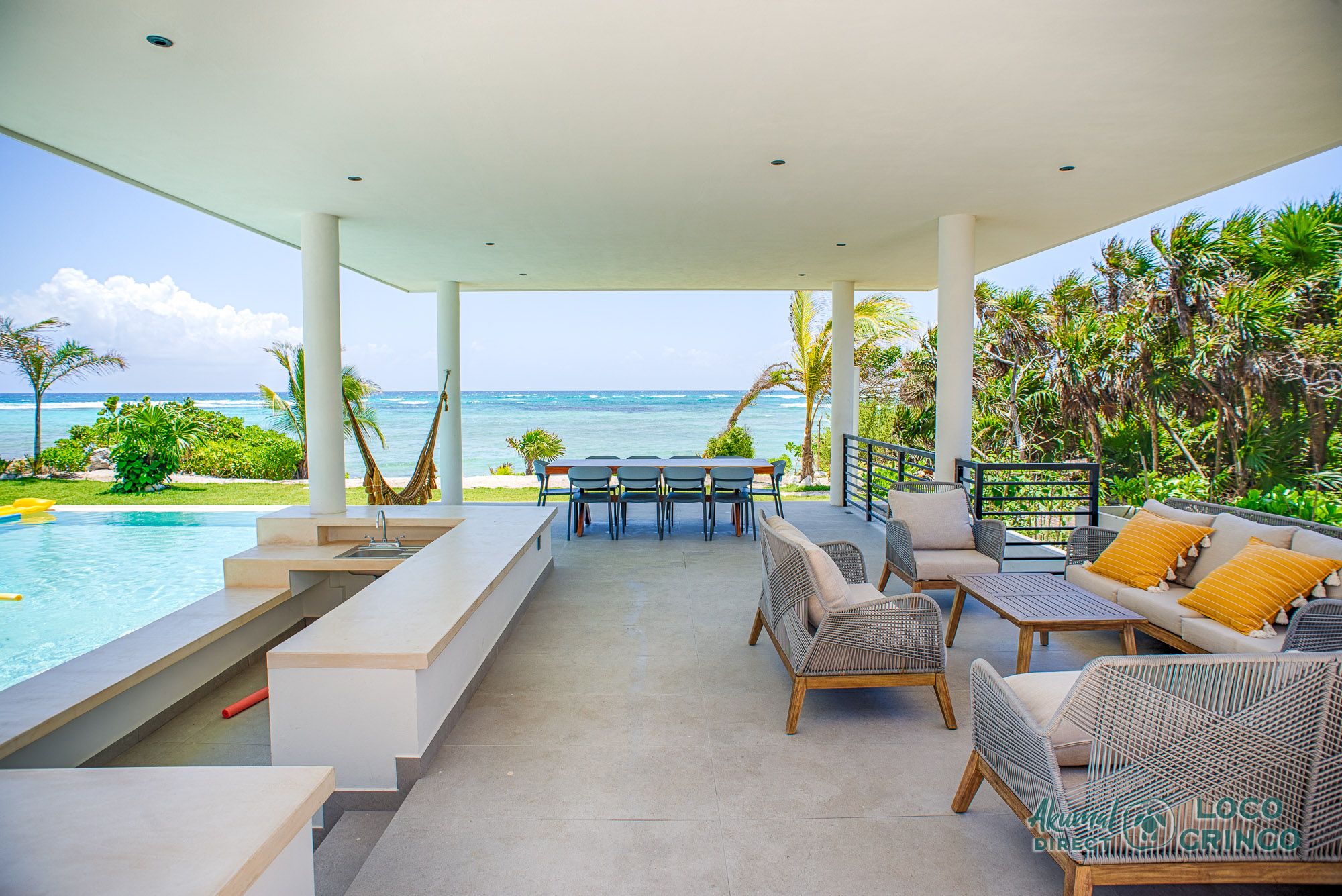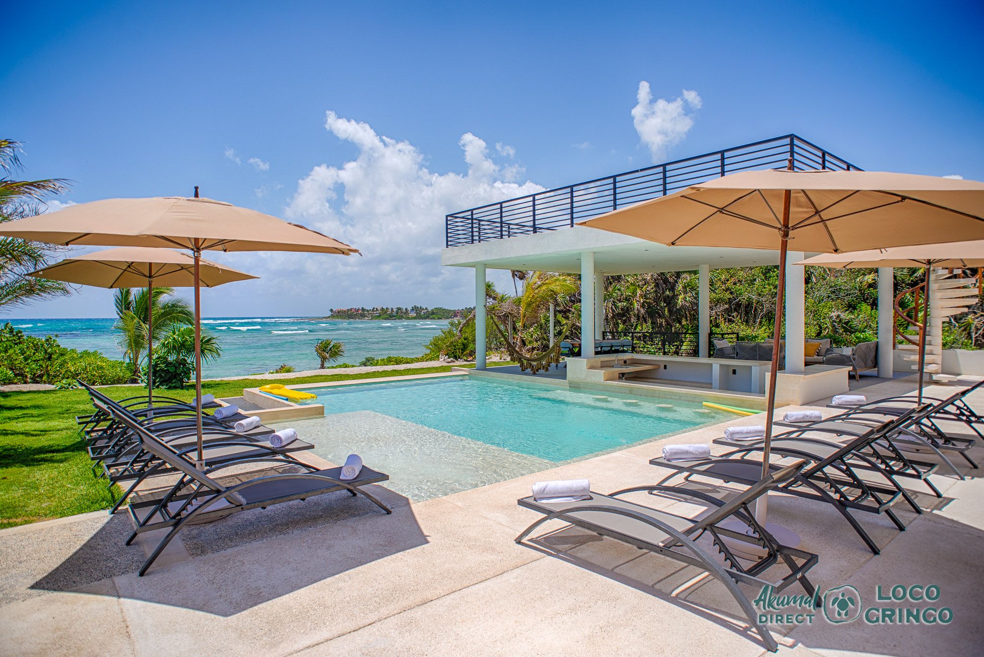 The heart of the home is the infinity pool area, where guests can relax on sun loungers and enjoy the breathtaking panoramic views of the Caribbean Sea. Just steps away, the private beach area with a mix of soft white sands and coral rocks offers easy access to the vibrant Meso-American reef, perfect for snorkeling and exploring marine life.