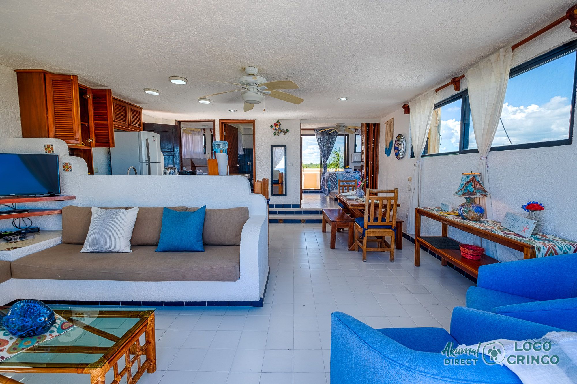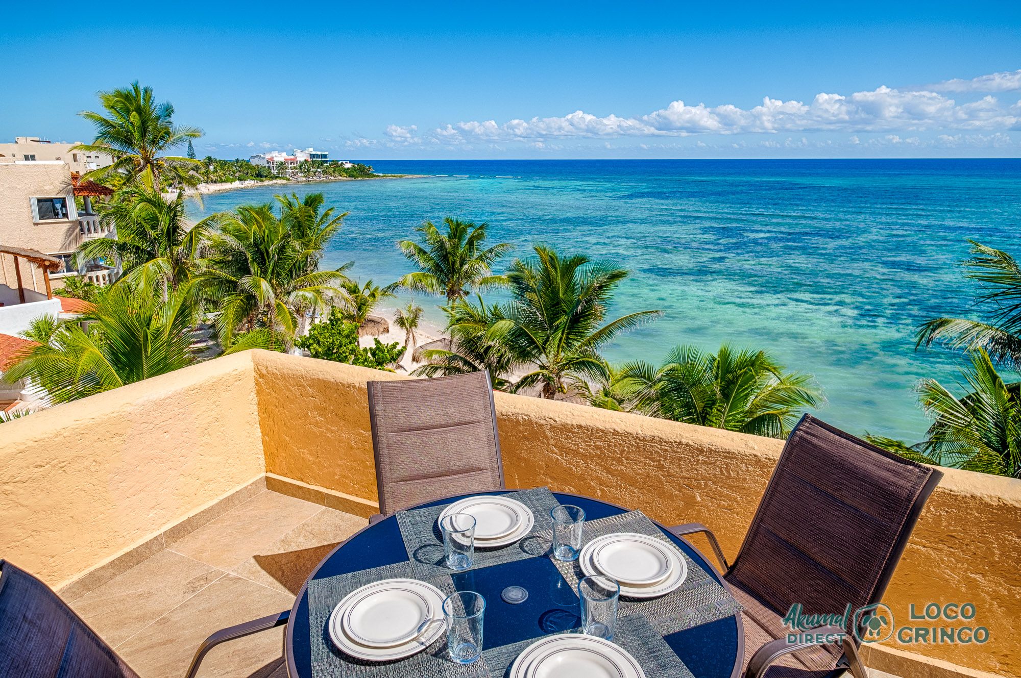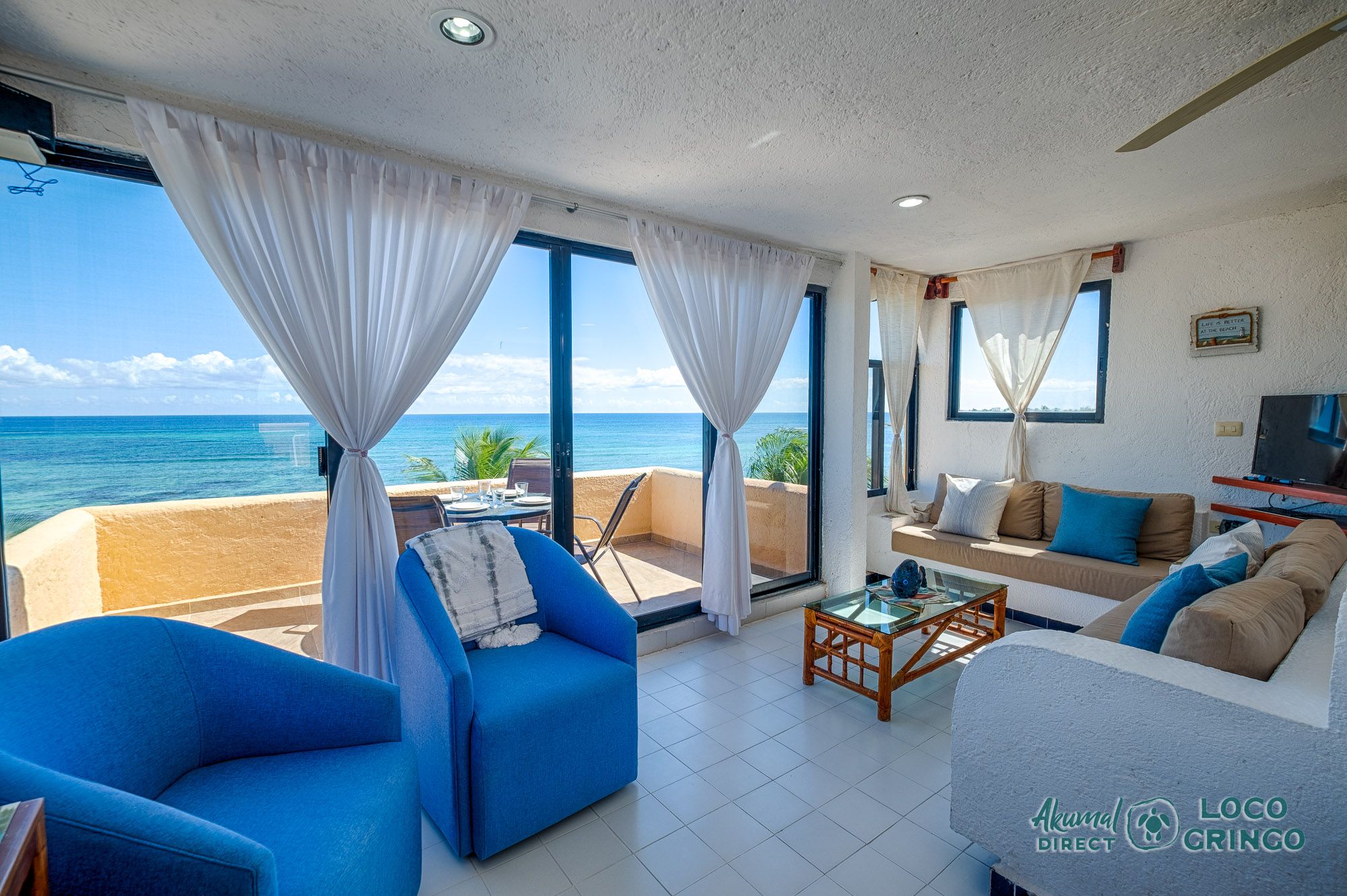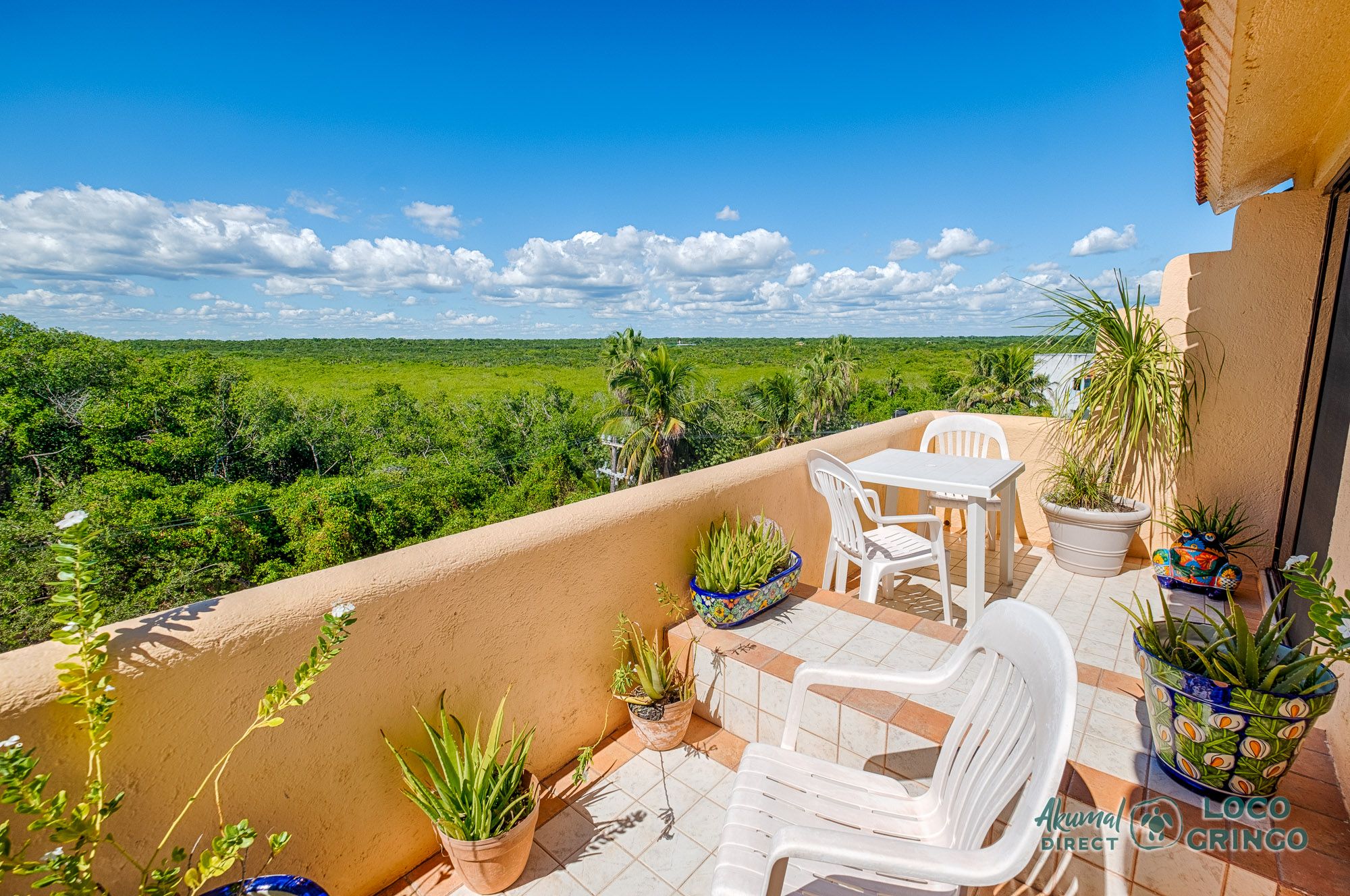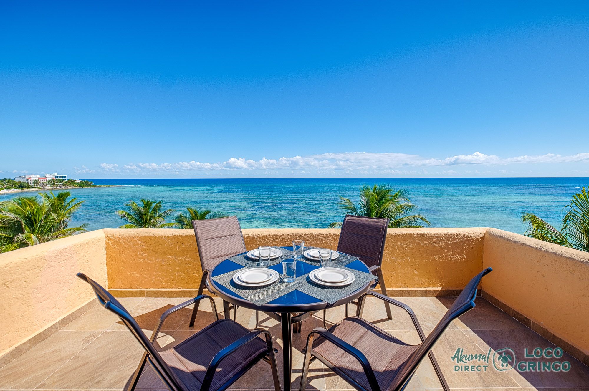 We had a wonderful experience with Akumal Direct. Everything was easy. We arrived after hours and the night security gave us the key and let us in. The unit was cleaned daily while we were out, and towels made fresh when wet or dirty. The view was spectacular from balconies on both the sea side and jungle side, for both amazing sunrise and sunset views. The A/C worked well to cool the unit, and windows let in lots of light. We ate every meal on the east balcony watching the birds and sea. The only thing to note was that, when a storm blew through, rain water came pouring in through the doors and windows despite being completely shut. We had to sweep the water towards vents built into the wall, and the ceiling fans dried the floors within a half hour, no damage done. Ants were also into everything, so keep food in sealed containers. Despite these little glitches, the stay was marvelous.