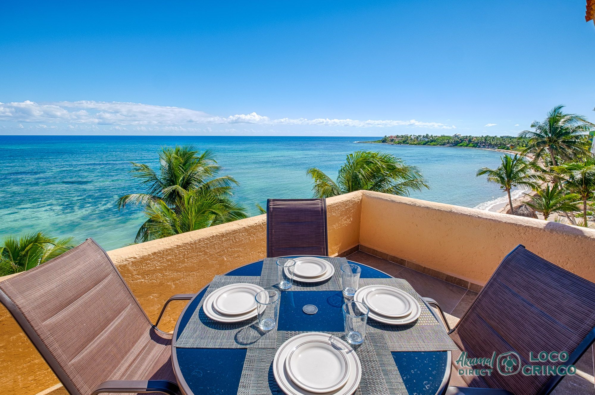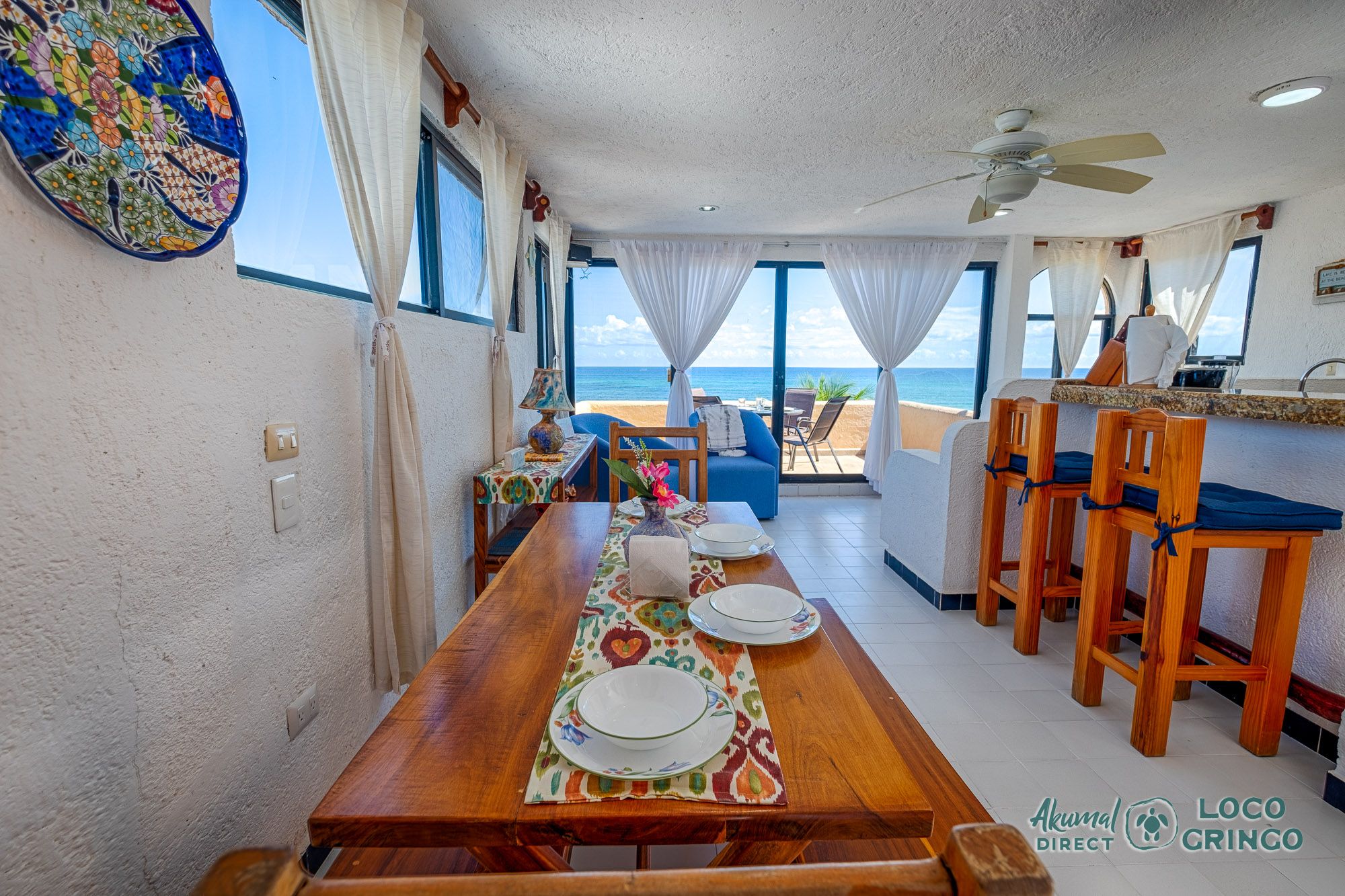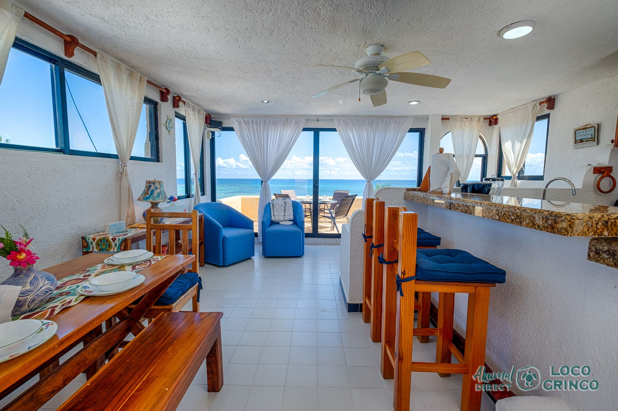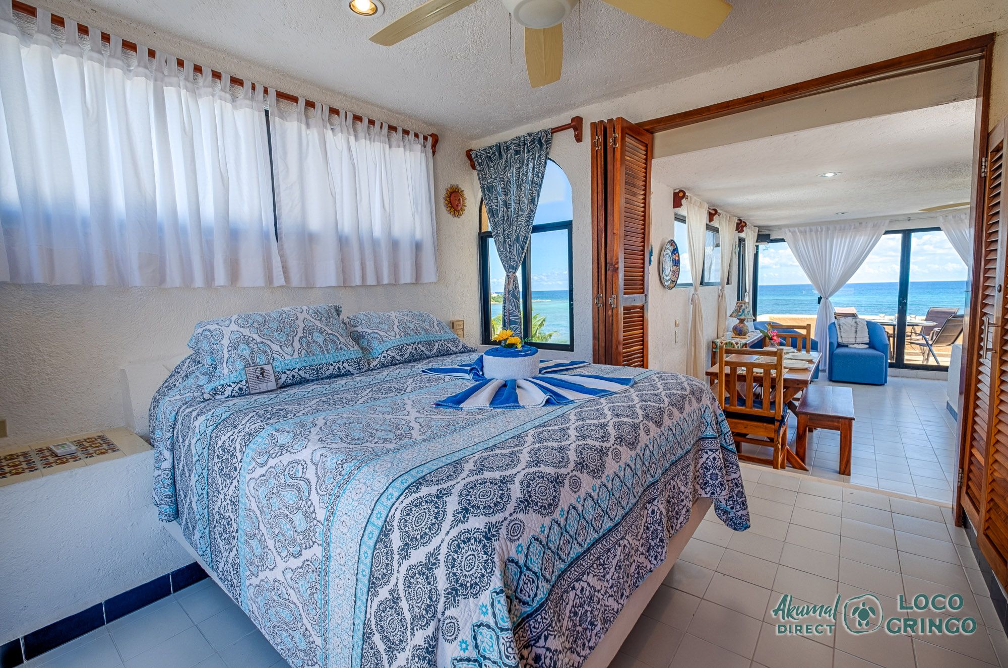 We had a wonderful experience with Akumal Direct. Everything was easy. We arrived after hours and the night security gave us the key and let us in. The unit was cleaned daily while we were out, and towels made fresh when wet or dirty. The view was spectacular from balconies on both the sea side and jungle side, for both amazing sunrise and sunset views. The A/C worked well to cool the unit, and windows let in lots of light. We ate every meal on the east balcony watching the birds and sea. The only thing to note was that, when a storm blew through, rain water came pouring in through the doors and windows despite being completely shut. We had to sweep the water towards vents built into the wall, and the ceiling fans dried the floors within a half hour, no damage done. Ants were also into everything, so keep food in sealed containers. Despite these little glitches, the stay was marvelous.