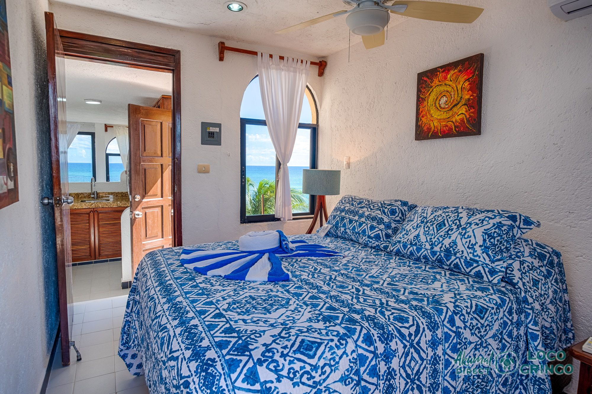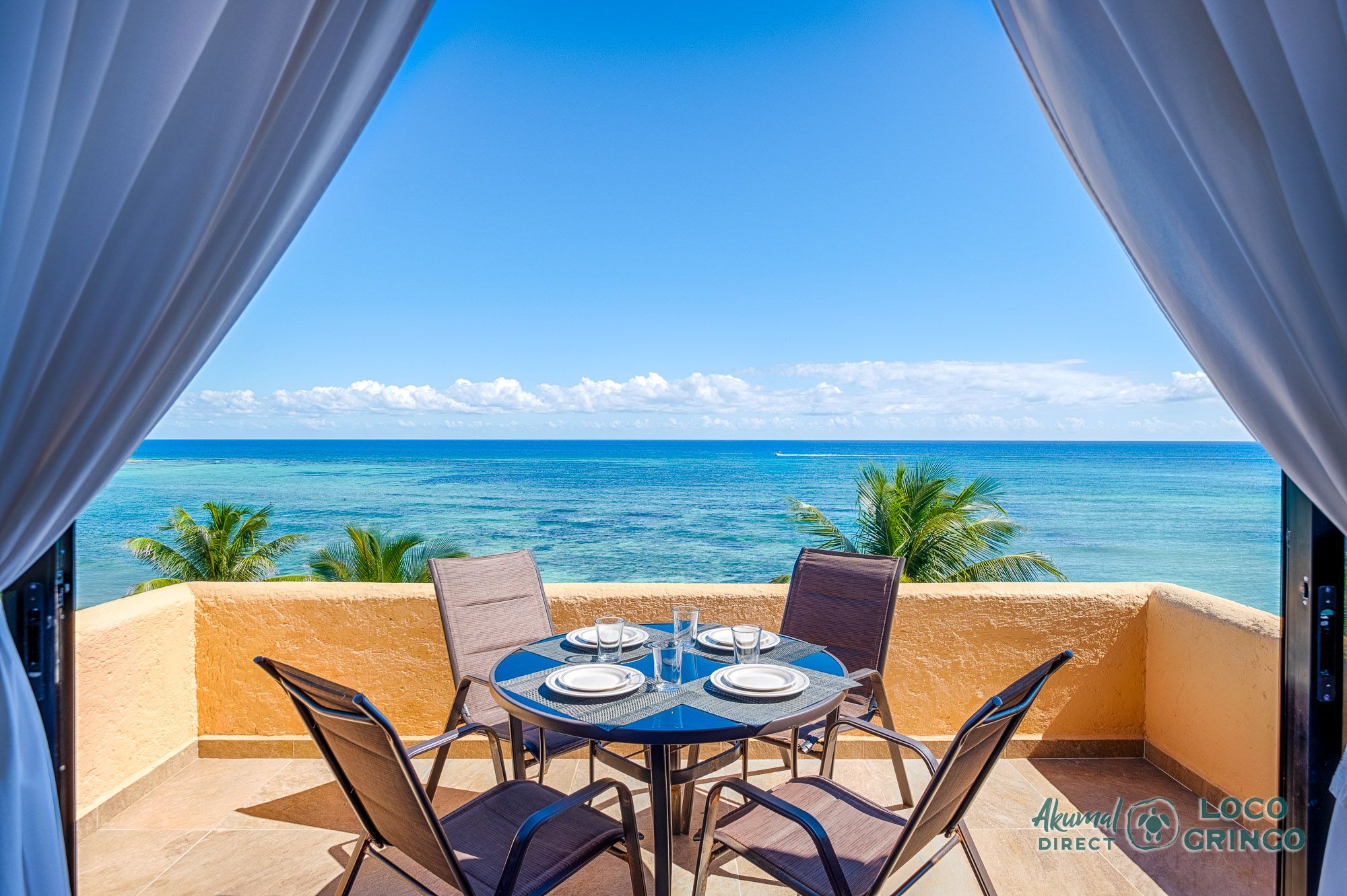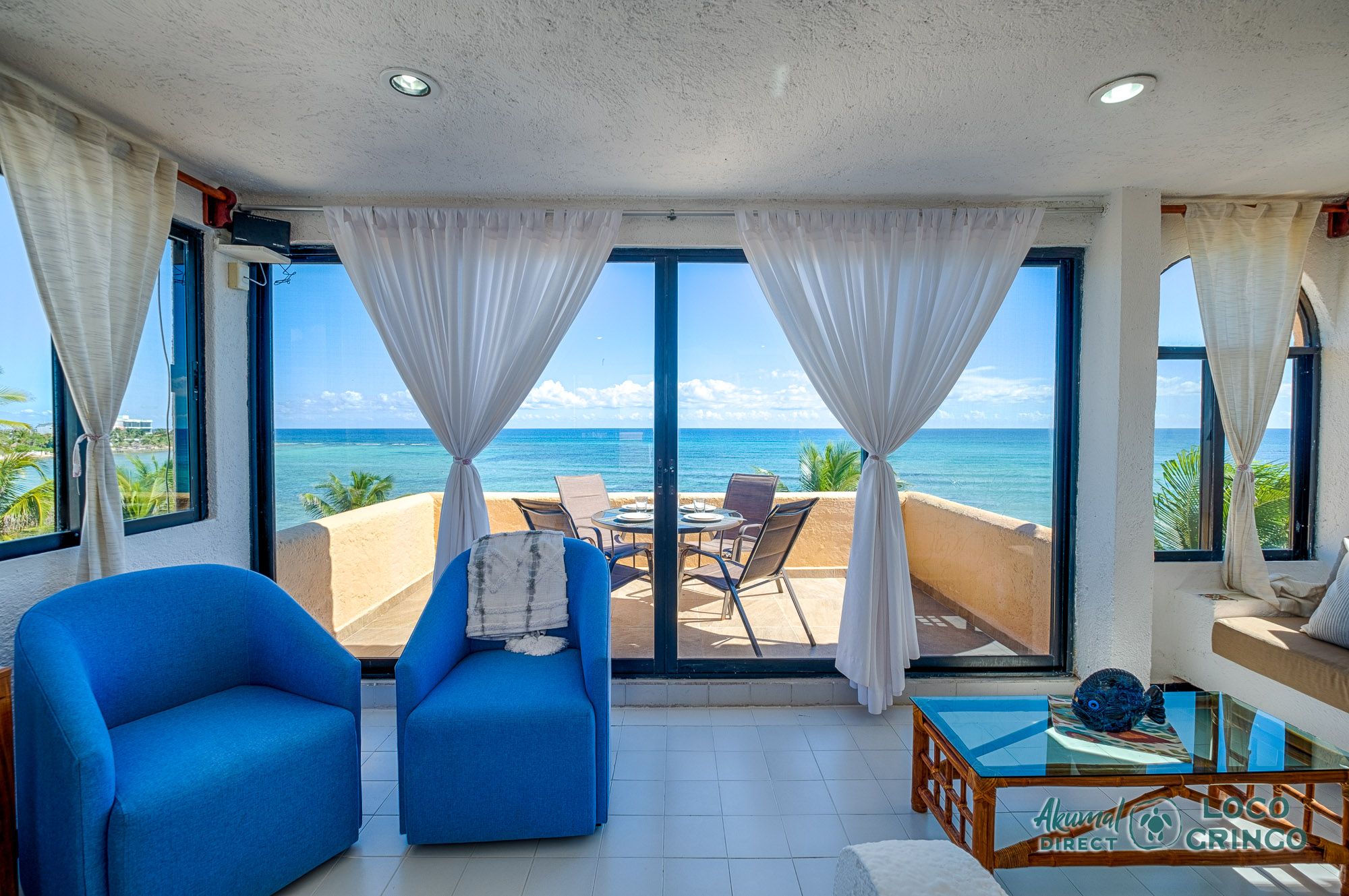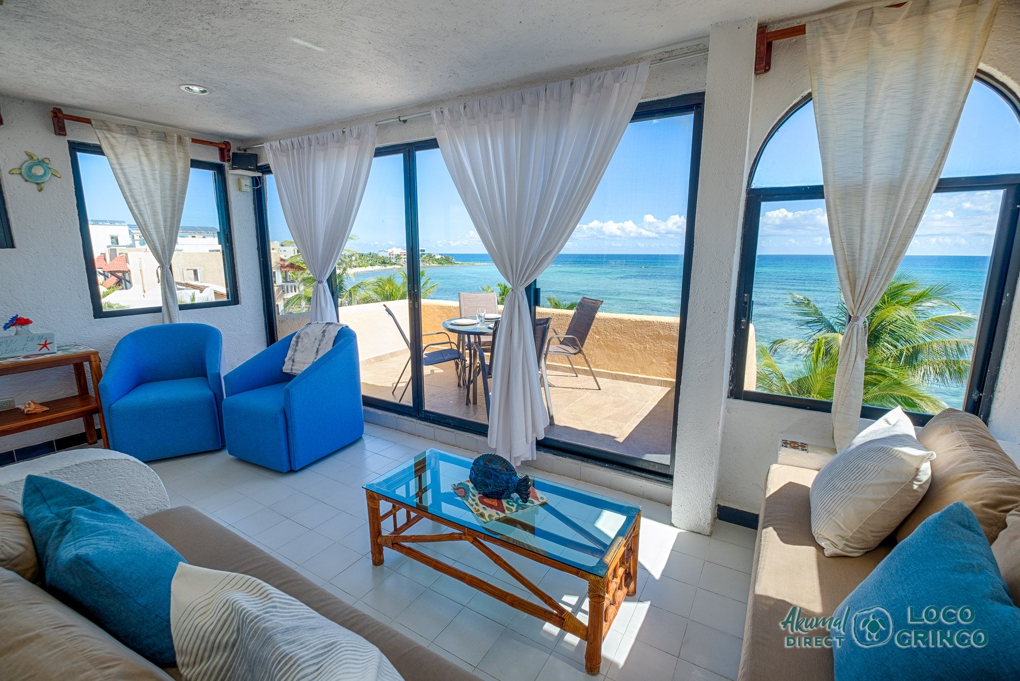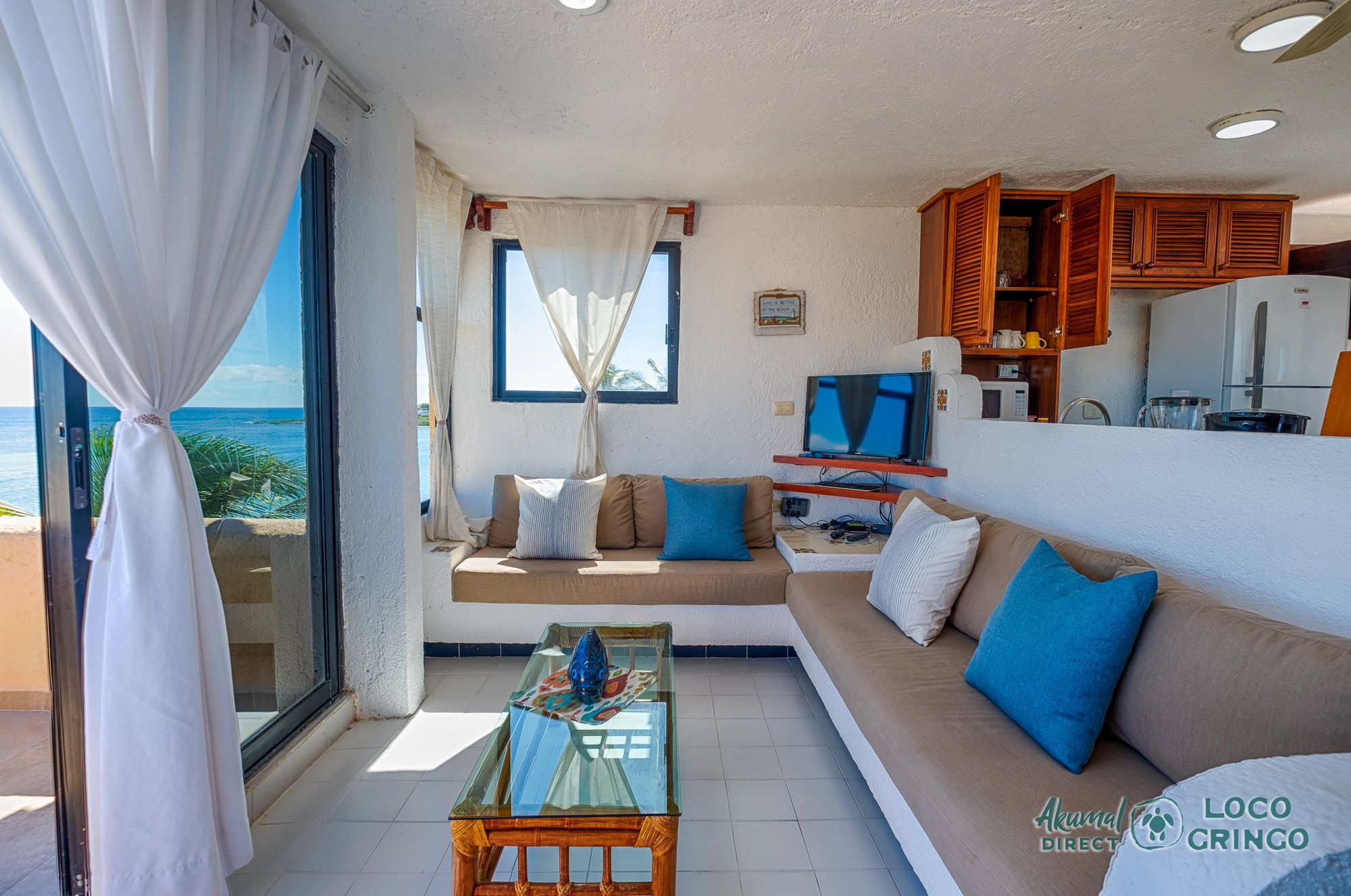 We had a wonderful experience with Akumal Direct. Everything was easy. We arrived after hours and the night security gave us the key and let us in. The unit was cleaned daily while we were out, and towels made fresh when wet or dirty. The view was spectacular from balconies on both the sea side and jungle side, for both amazing sunrise and sunset views. The A/C worked well to cool the unit, and windows let in lots of light. We ate every meal on the east balcony watching the birds and sea. The only thing to note was that, when a storm blew through, rain water came pouring in through the doors and windows despite being completely shut. We had to sweep the water towards vents built into the wall, and the ceiling fans dried the floors within a half hour, no damage done. Ants were also into everything, so keep food in sealed containers. Despite these little glitches, the stay was marvelous.