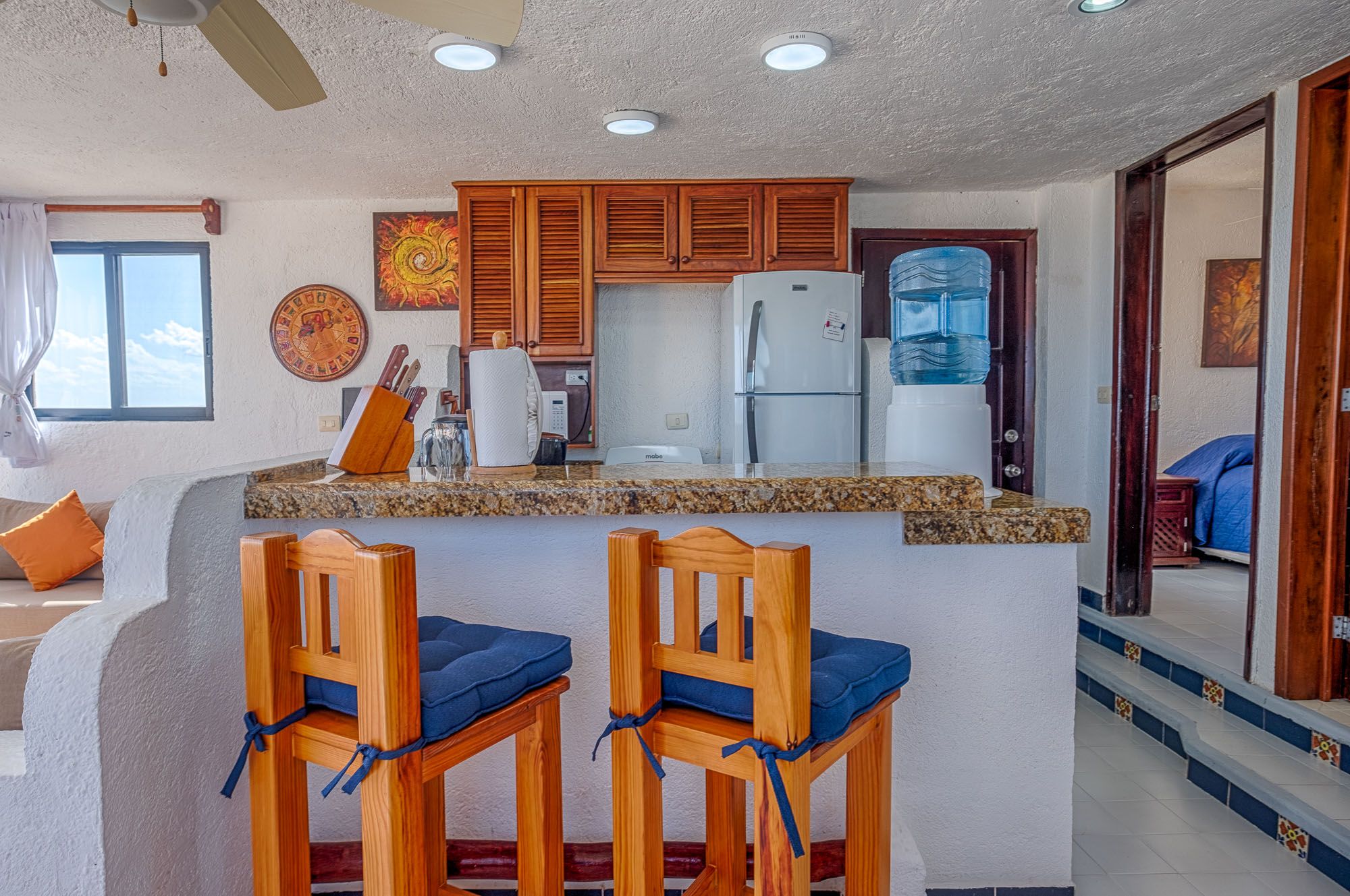First time at La Bahia, but dozen times in Akumal. Perfect unit for 2 adults since only 1 bath. Great view from Patio of bay & for star gazing at nite. Please note on 4th floor & NO elevator, so LOTS of steps to get yourself & luggage to #7. Fine for us but need to be in shape. Sargassum was really bad and whole bay had issues keeping up with cleaning beach, which was a bit of a downer.
