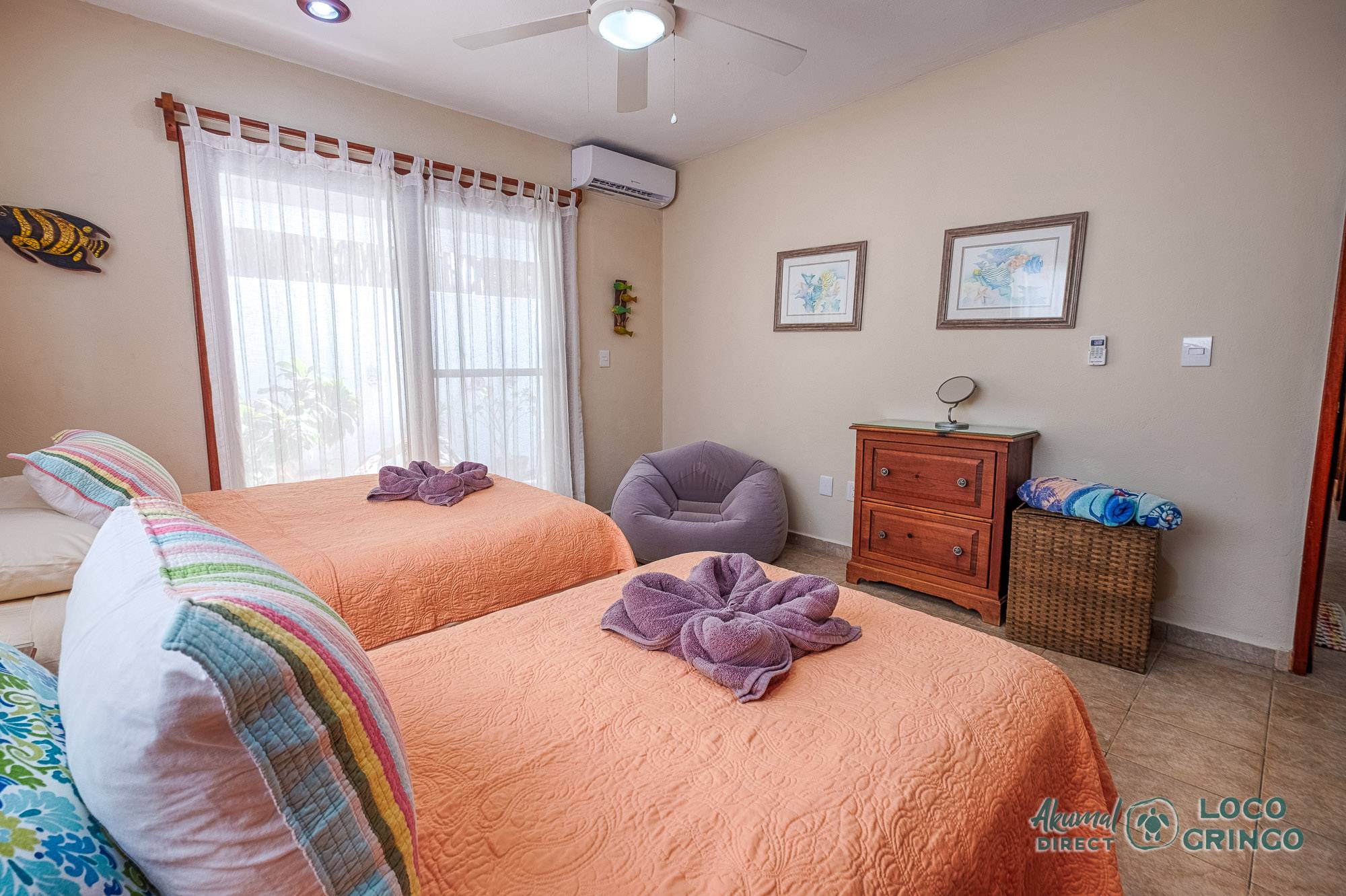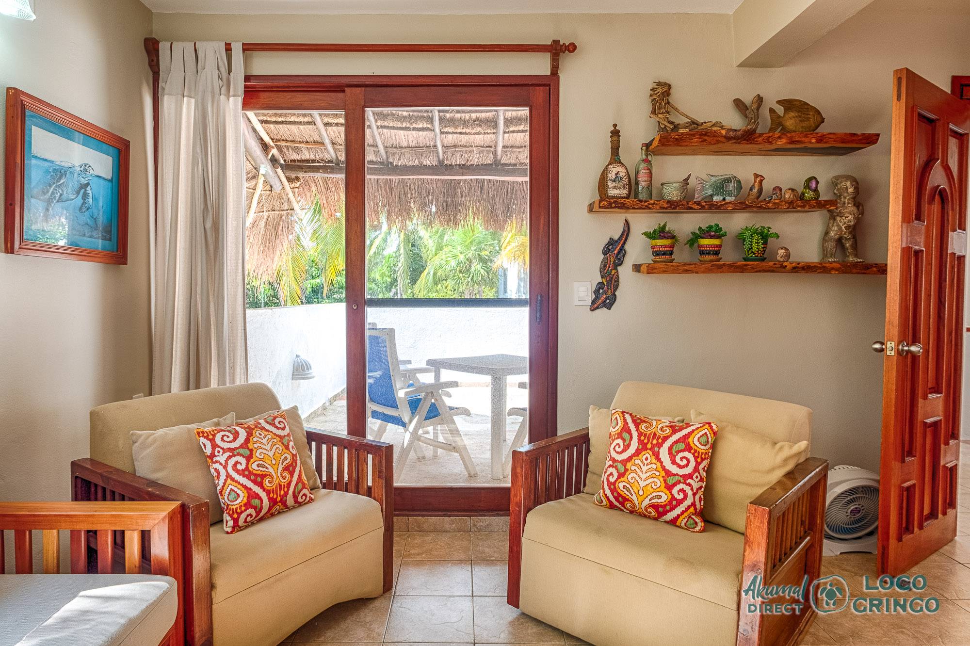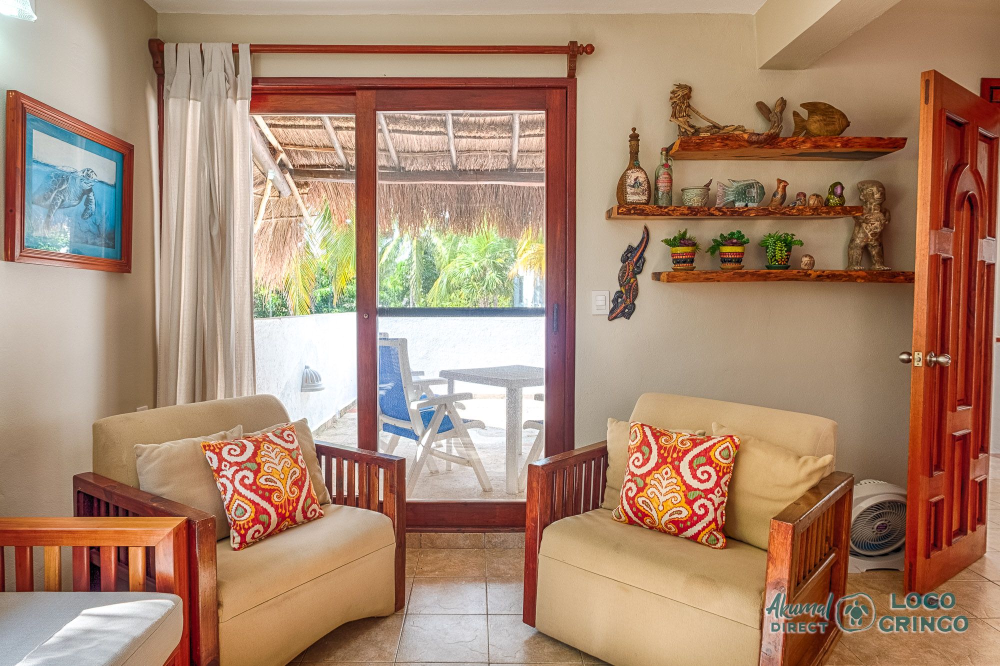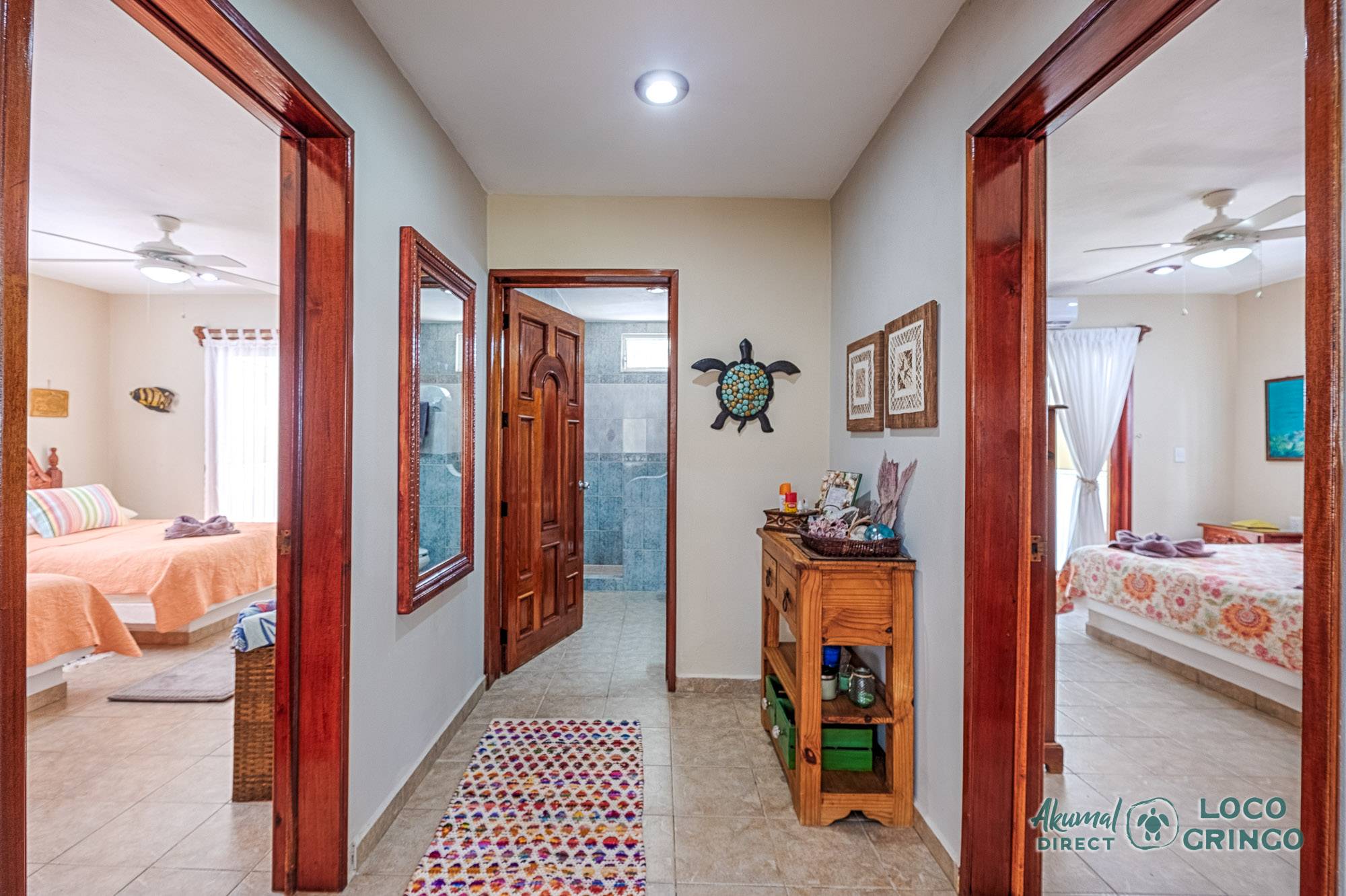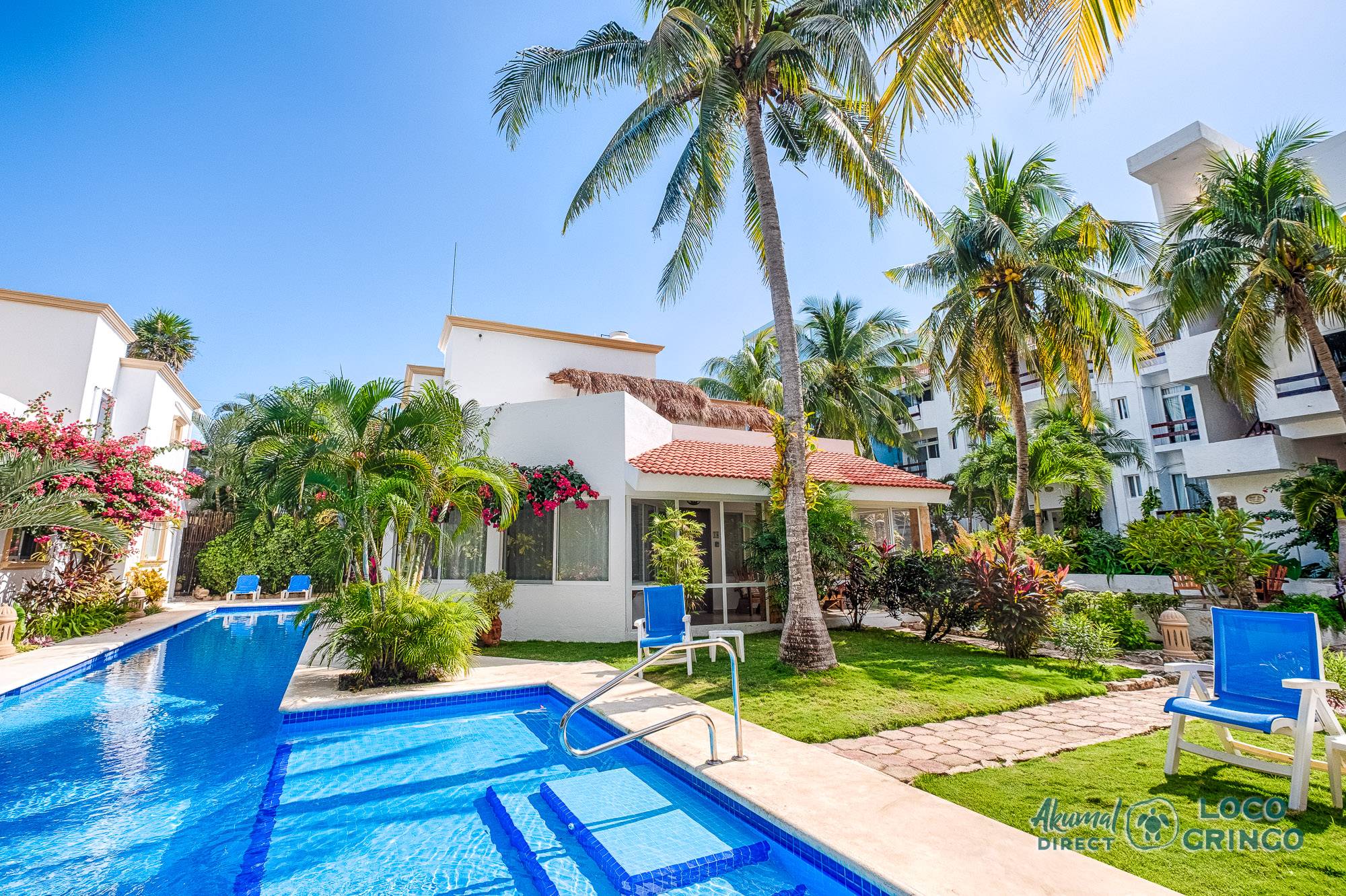 This quiet section of Half Moon Bay is close to Yal Ku Lagoon and several favorite local restaurants. The area is walkable, but public transportation is limited and the access road to the highway is unpaved. For grocery runs, cenotes, or beach-hopping days, we highly recommend renting a car or arranging a private driver. Locogringo guests can always count on our team for insider tips.