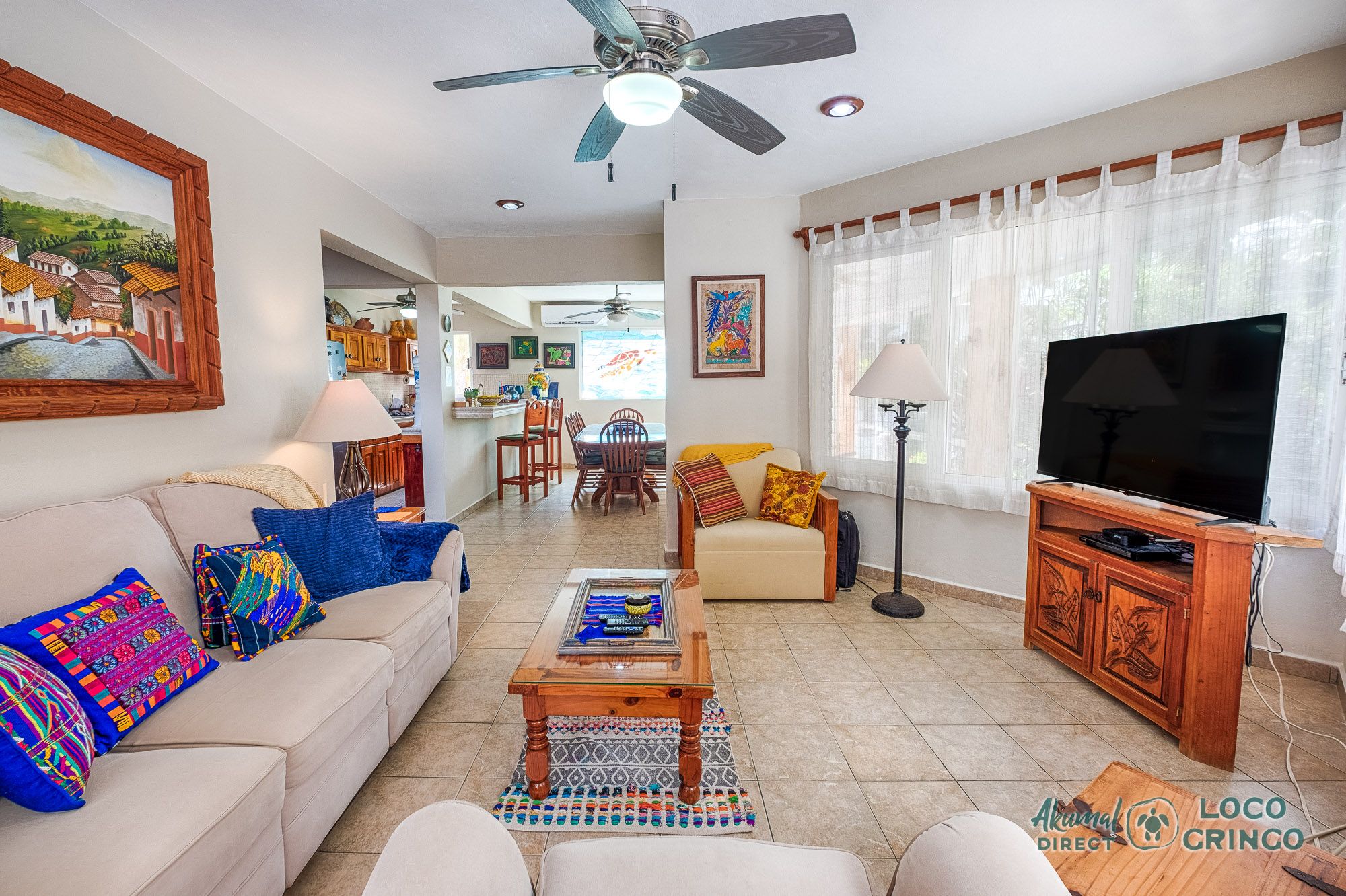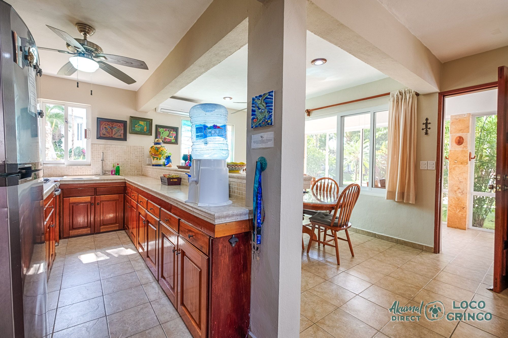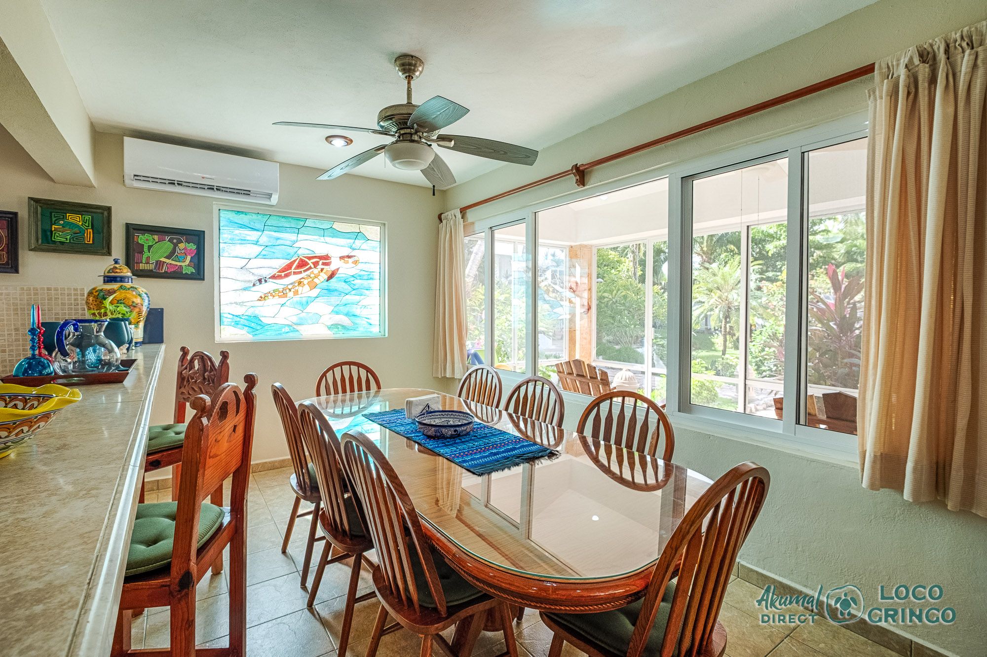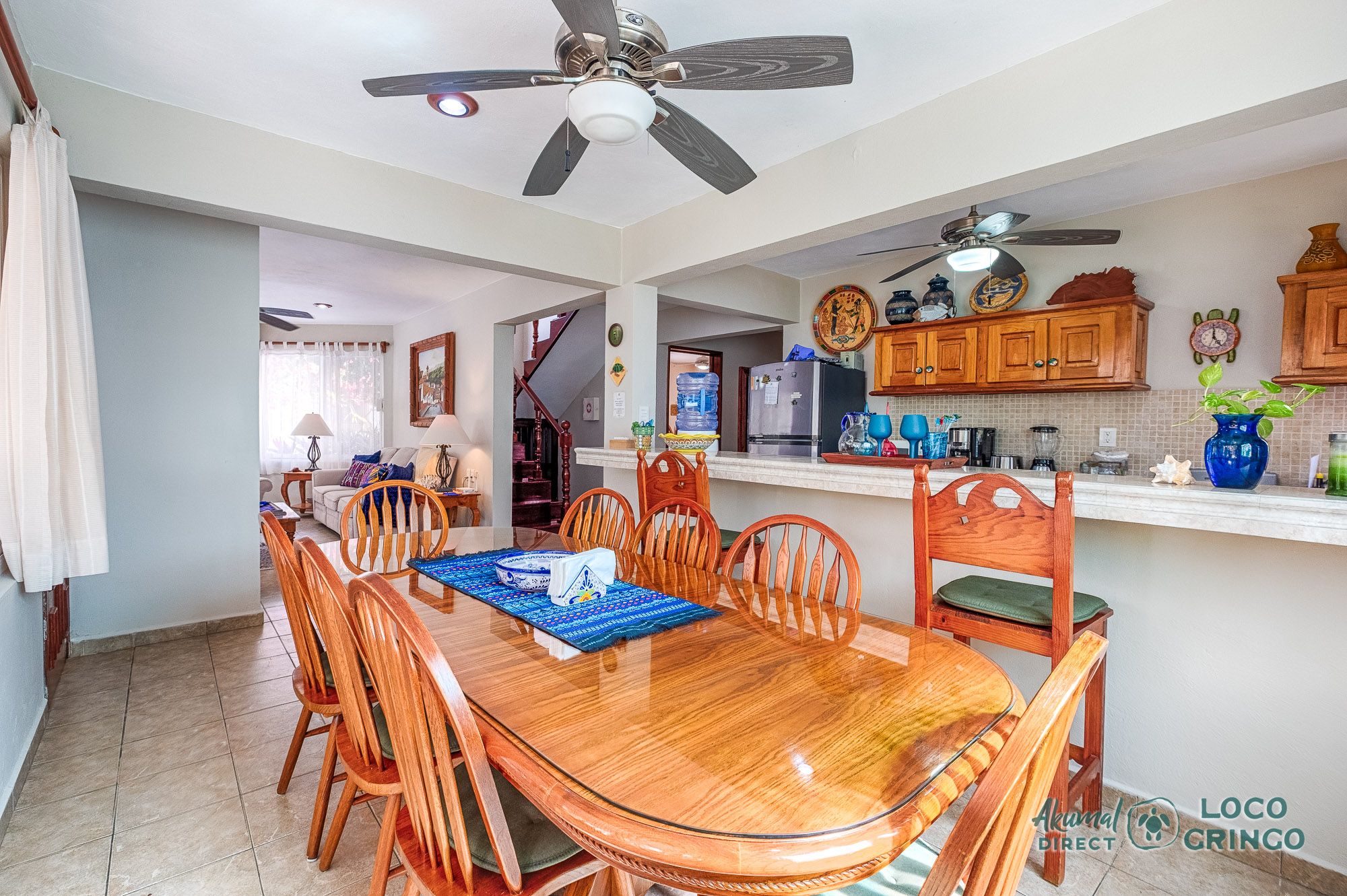 This inviting two-story villa blends comfort and Caribbean charm, offering plenty of space for travelers who love the feel of a private home near the water. The ground floor features an open living, dining, and kitchen area cooled by a shared air-conditioning unit. Garden views brighten the space, making it easy to unwind after snorkeling or exploring Akumal.