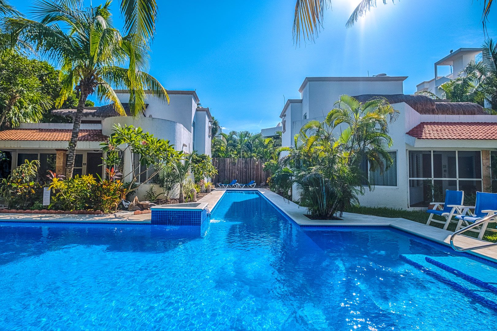 Poolside garden villa with three bedrooms, full A/C, terrace, screened patio, and easy beach access. A peaceful Half Moon Bay stay with room for families and friends.