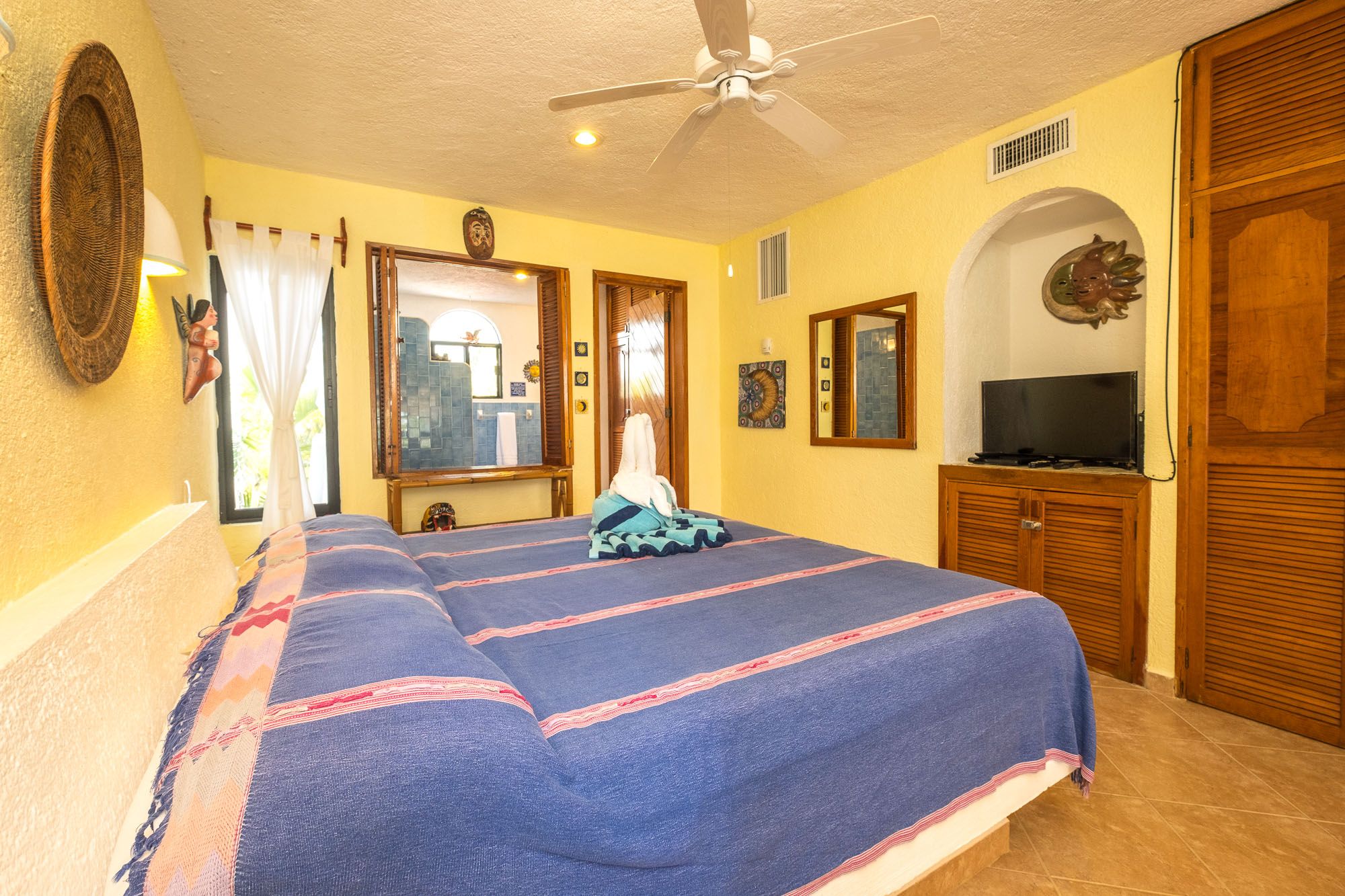 Master Bedroom Views with king bed and en suite bathroom, AC and TV Luna Azul condo 4 Half Moon Bay beach Akumal Mexico 2 bedroom vacation rental second level