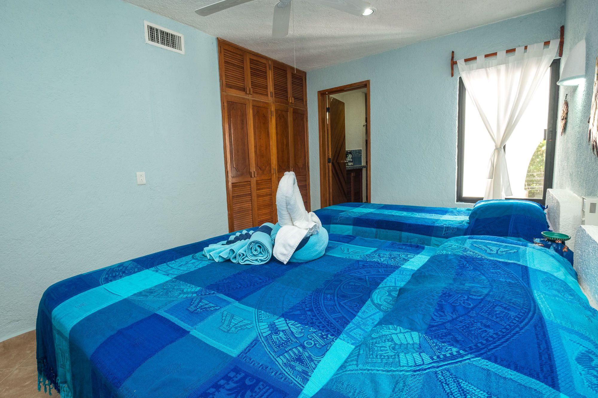 Master Bedroom king bed Luna Azul condo 4 Half Moon Bay beach Akumal Mexico 2 bedroom vacation rental second level