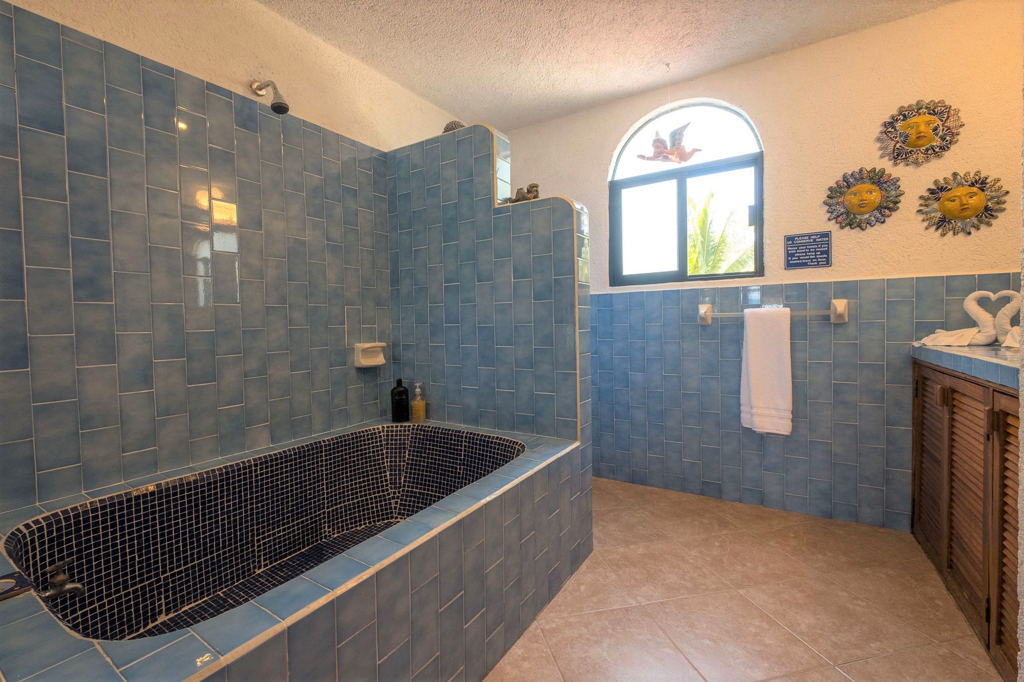 Master Bathroom with tub and shower Luna Azul condo 4 Half Moon Bay beach Akumal Mexico 2 bedroom vacation rental second level