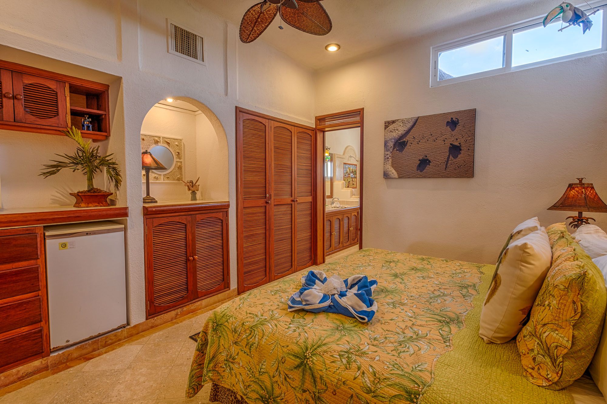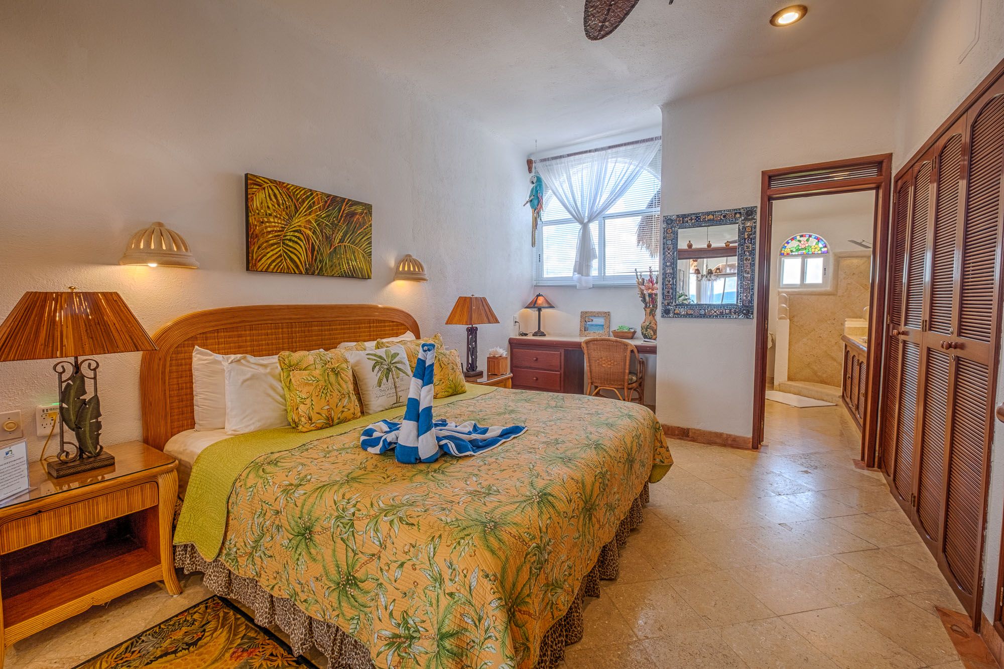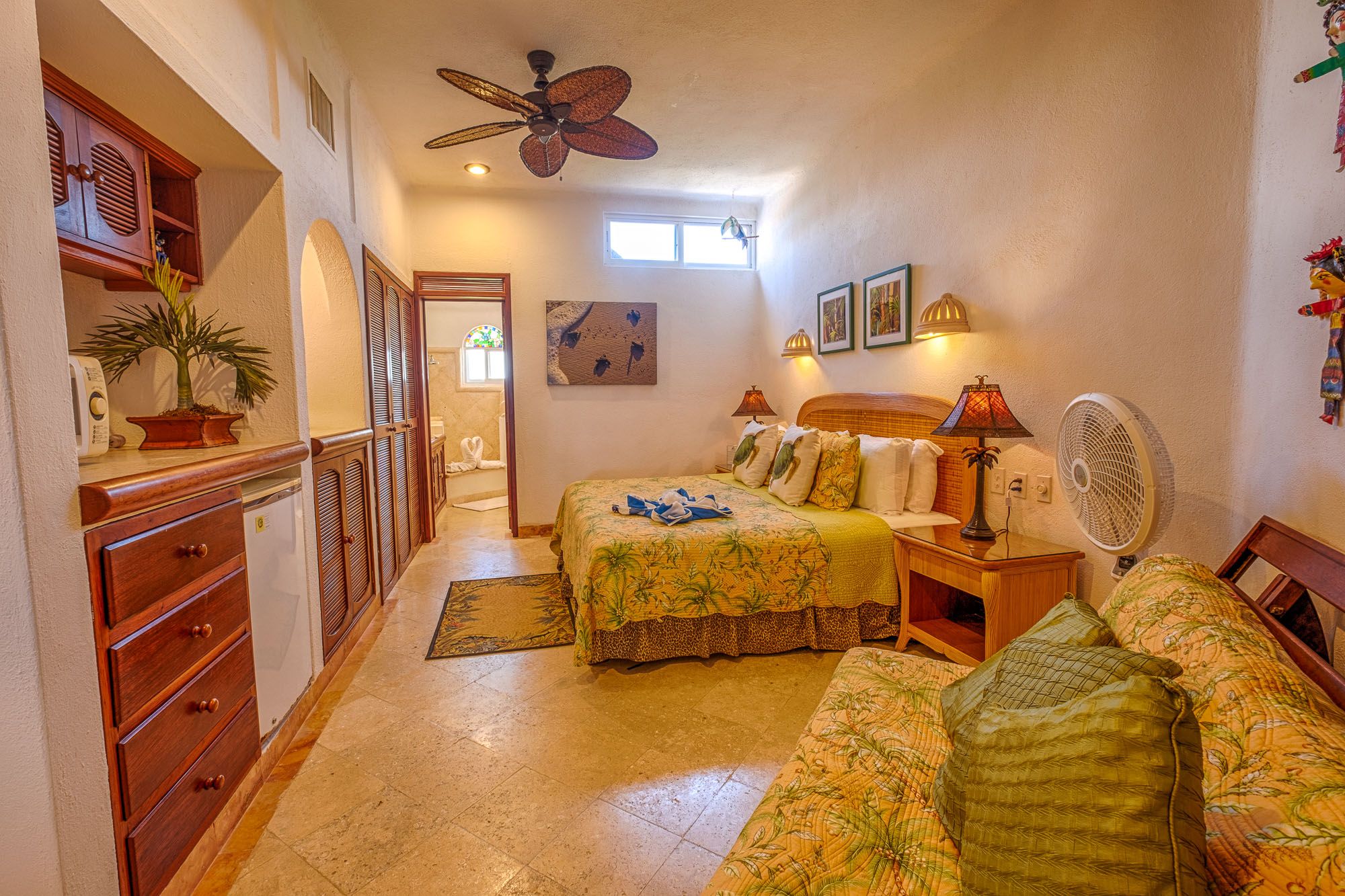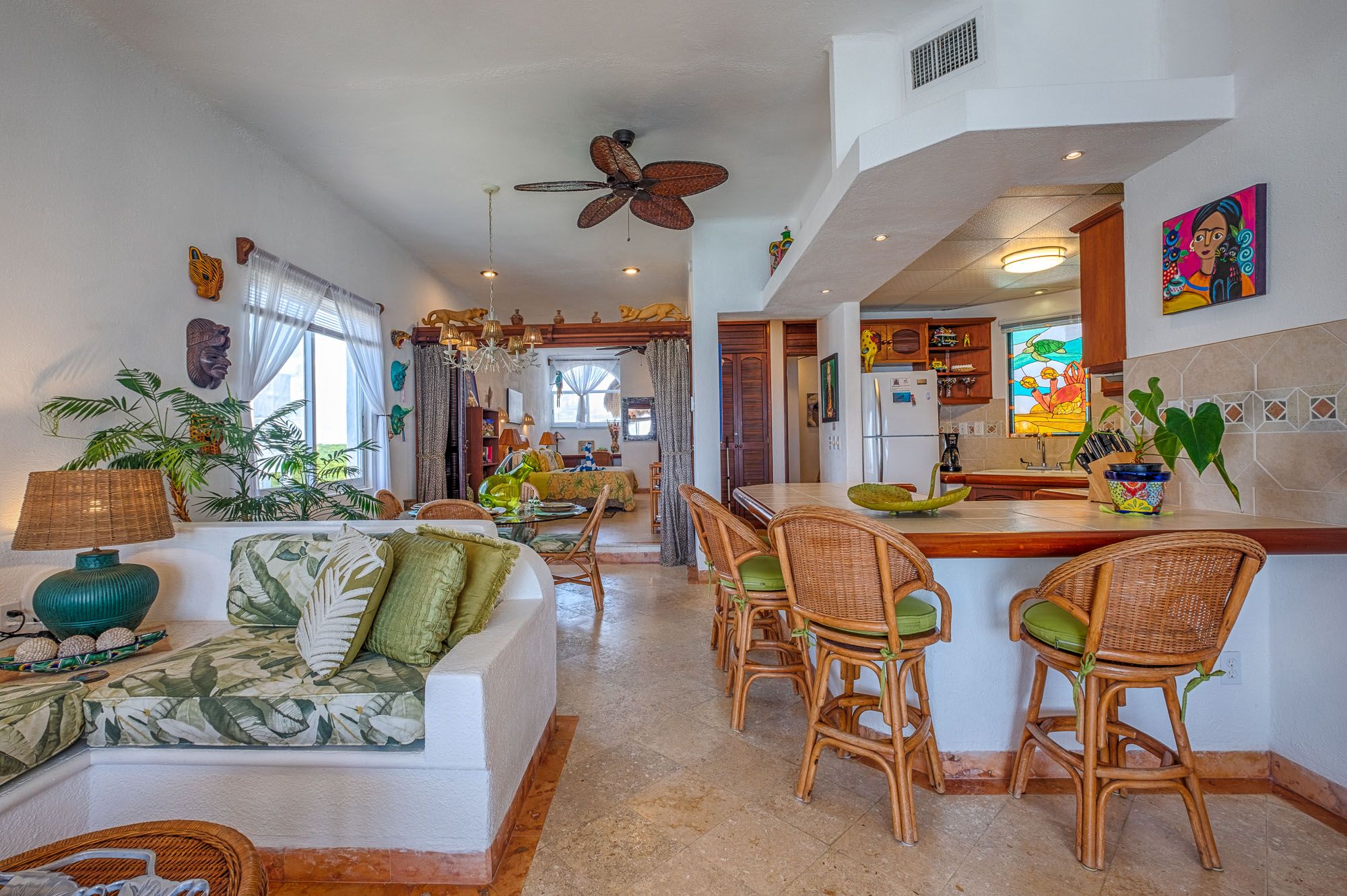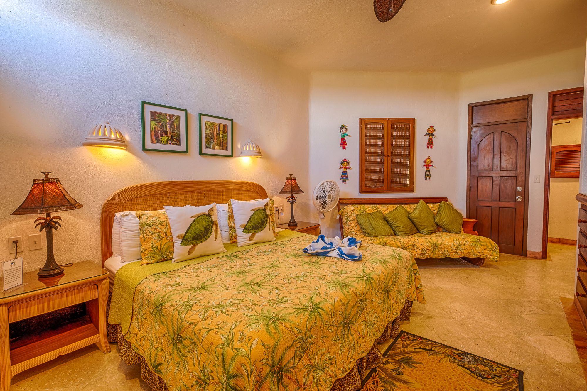 This penthouse condo greets you with bright colors and wide windows framing Half Moon Bay. The master suite includes a king bed, ensuite bathroom, and air conditioning. The guest suite feels like a second master, with a king bed, sofa bed, private bath, and air conditioning. Both rooms open to comfortable, restful spaces perfect after a day on the beach.