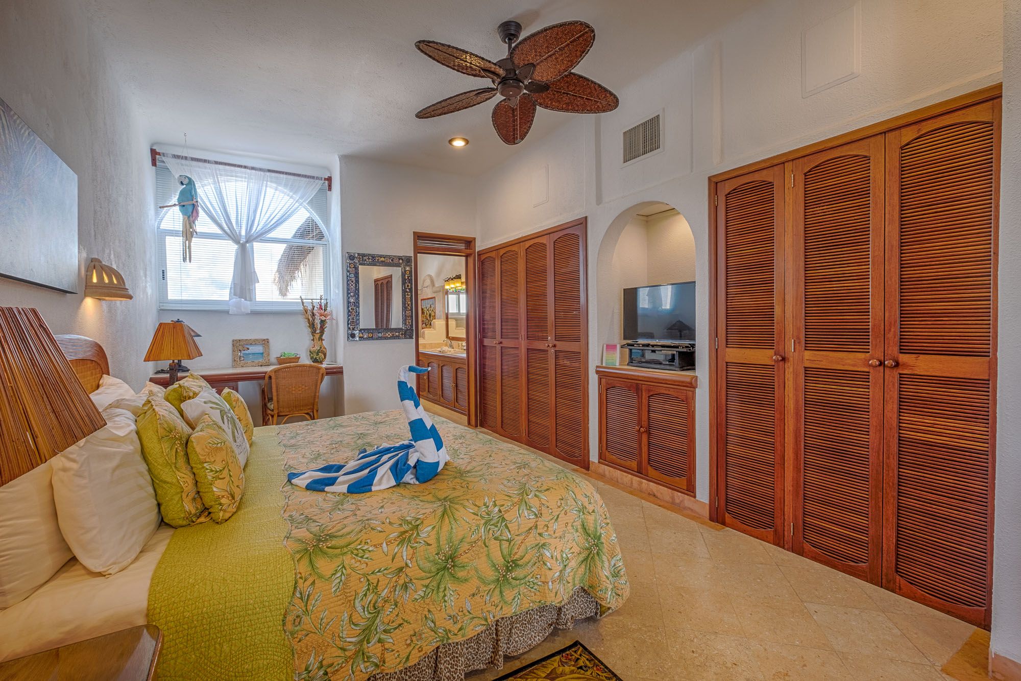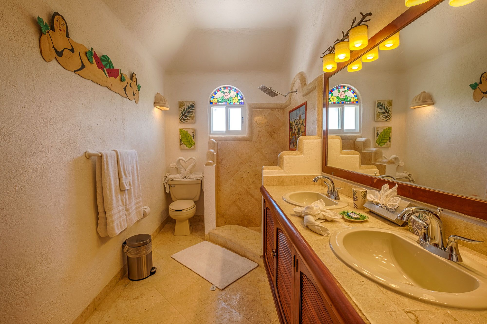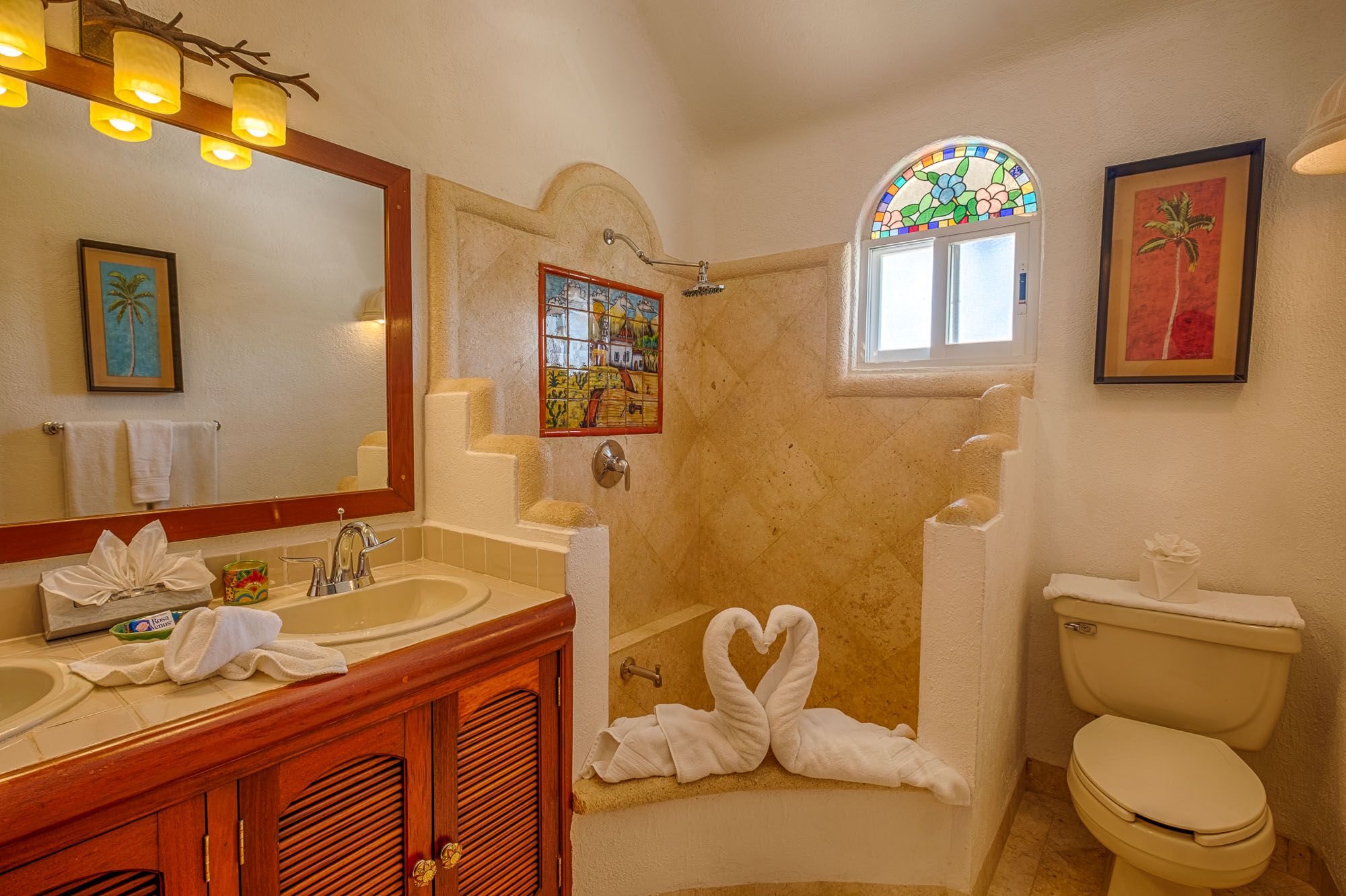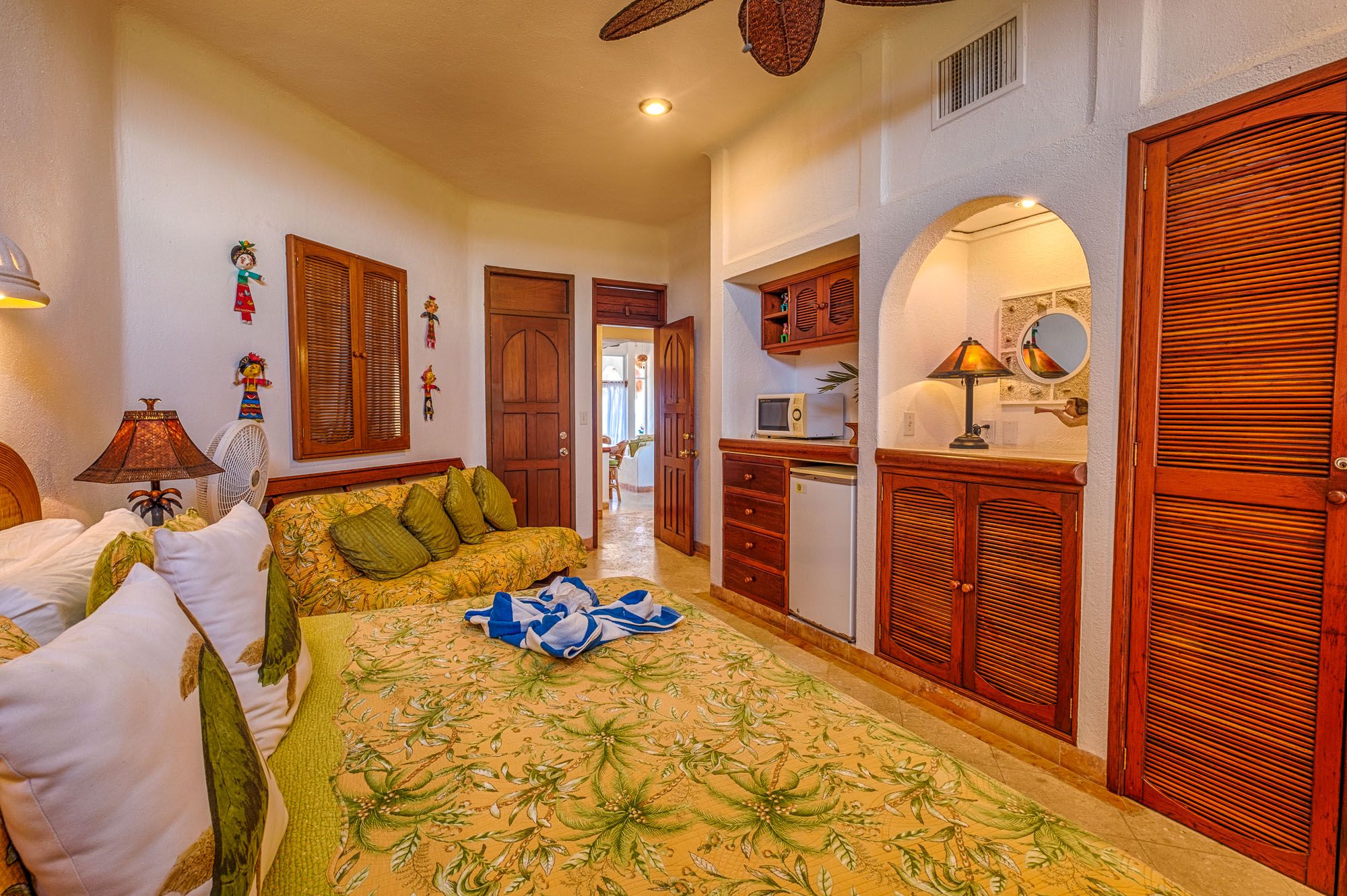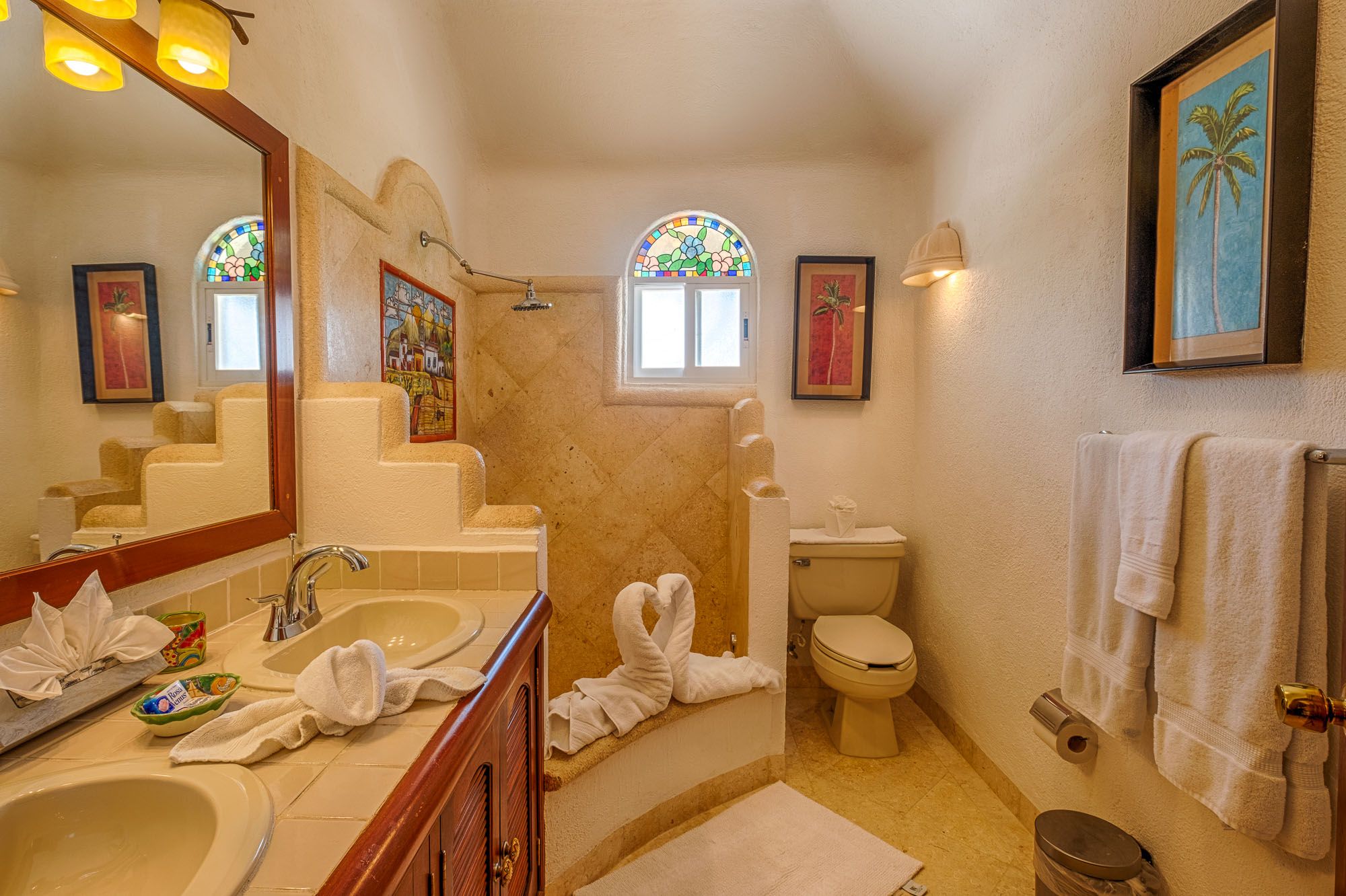This penthouse condo greets you with bright colors and wide windows framing Half Moon Bay. The master suite includes a king bed, ensuite bathroom, and air conditioning. The guest suite feels like a second master, with a king bed, sofa bed, private bath, and air conditioning. Both rooms open to comfortable, restful spaces perfect after a day on the beach.