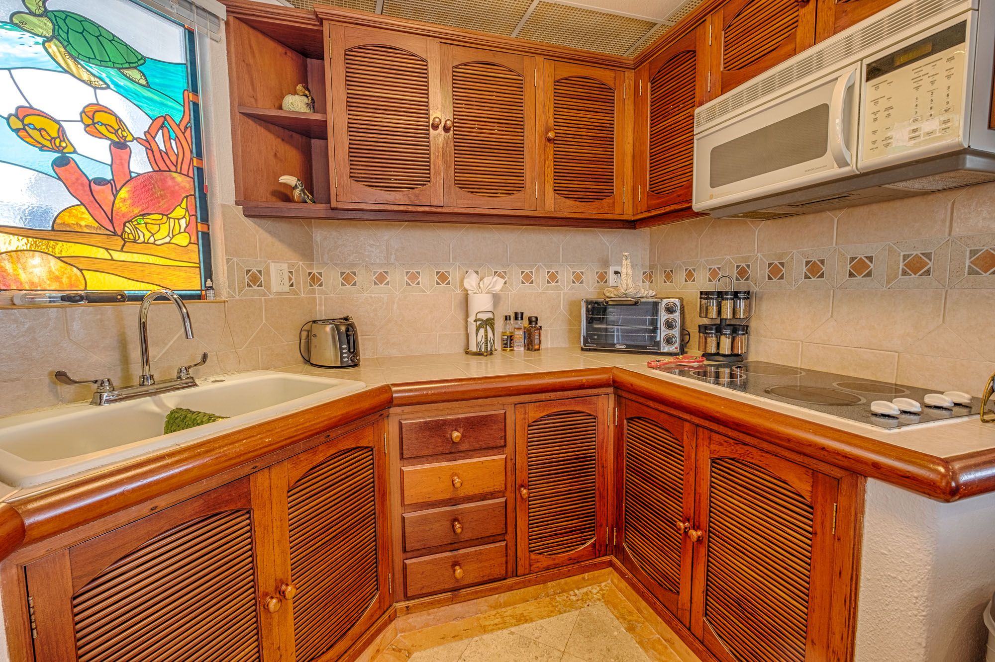 The condo is on the fourth floor and accessible by stairs only. Half Moon Bay’s shoreline has areas of coral rock—water shoes are recommended for snorkeling or swimming. Daily housekeeping service is provided. Parking, beach towels, and purified water are provided.