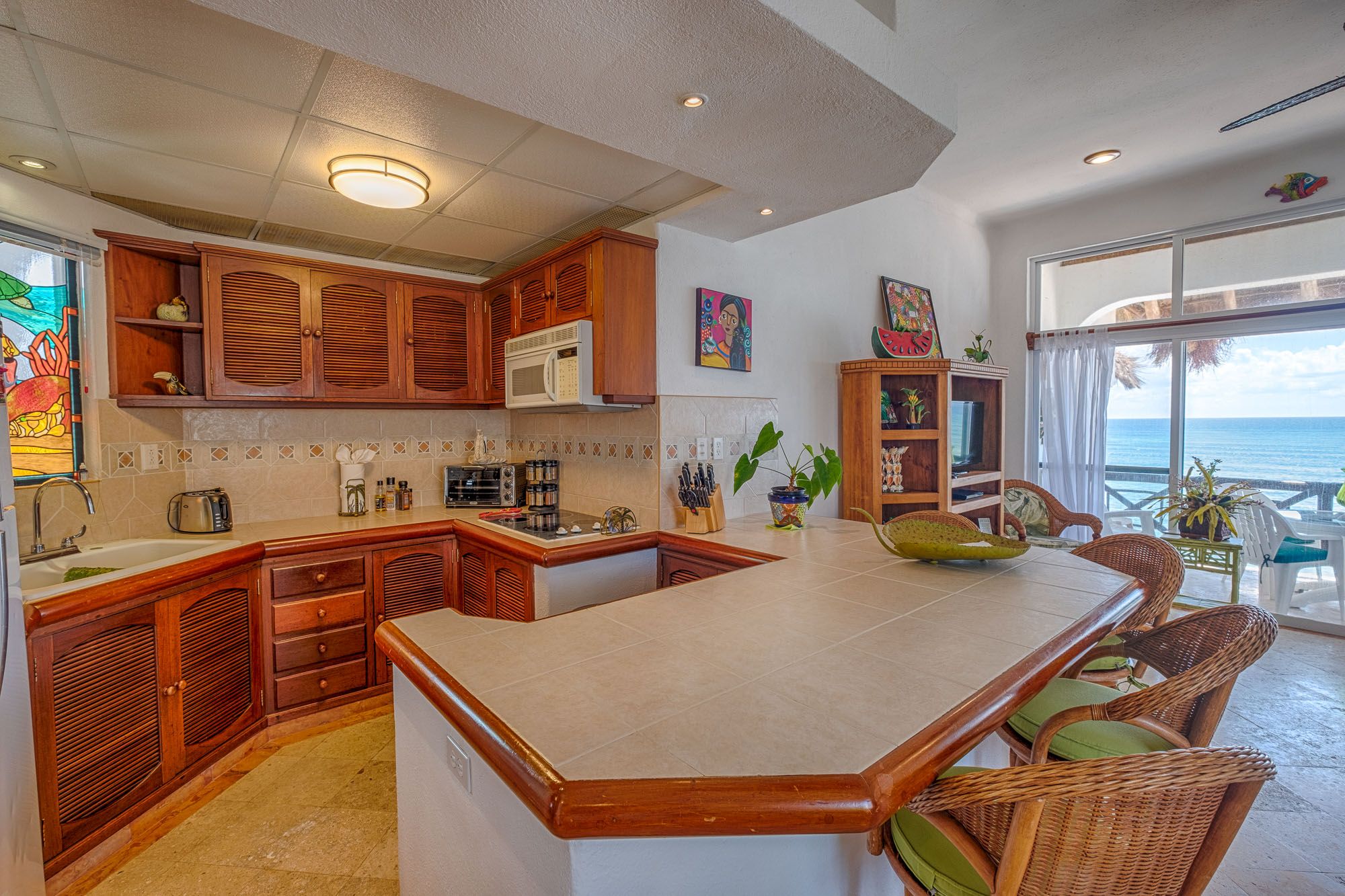 The living and dining areas share the same views, with sliding doors leading to a fully furnished corner terrace. This terrace is the heart of the condo, where guests gather to enjoy sea breezes, coffee at sunrise, or evening cocktails. The kitchen is stocked with modern appliances and a breakfast bar, making it easy to prepare meals while still facing the Caribbean.