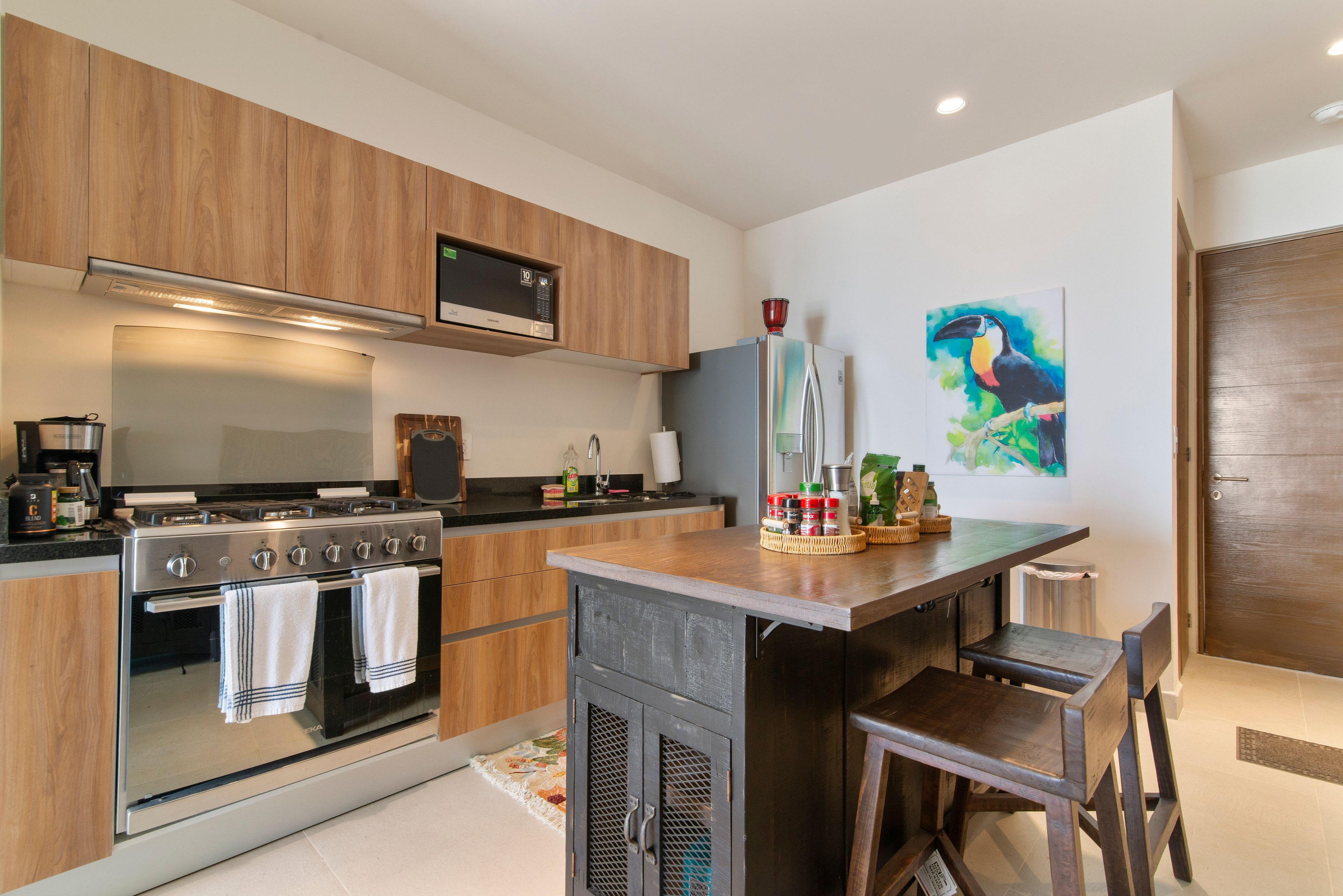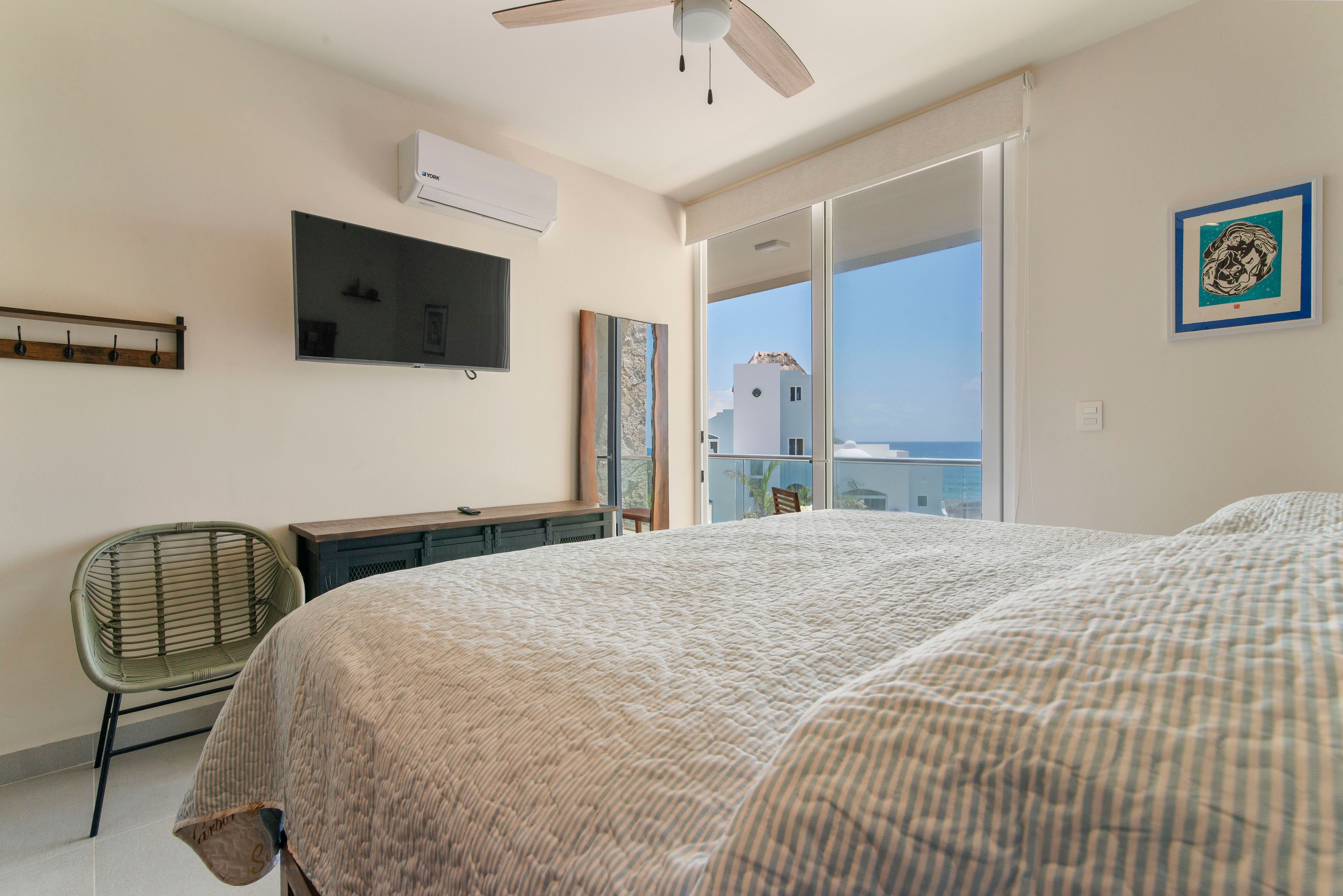 Inside, the penthouse blends boho-modern style with natural wood, stone accents, and abundant sunlight to create a serene atmosphere. The open living and dining area overlooks the ocean, while the fully equipped kitchen includes a breakfast bar perfect for casual meals. The primary bedroom features an ocean-view king bed and an ensuite bathroom; the guest suite features a queen bed, an ensuite bathroom, and a lush jungle view. All rooms, including the living area, are air-conditioned for your comfort. Guests also enjoy fast Wi-Fi, daily housekeeping, purified water, private parking, and dedicated concierge support.
